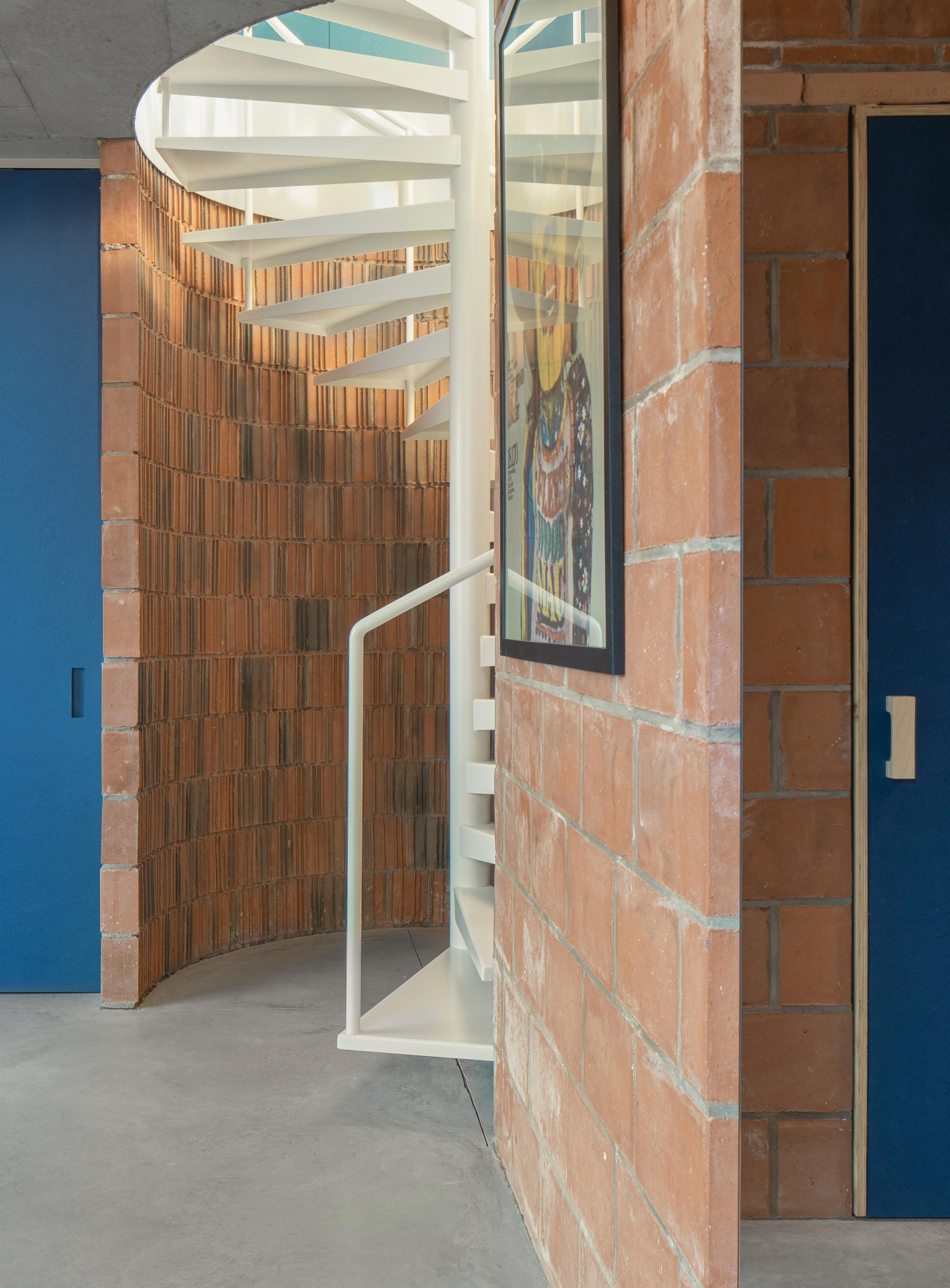 Para além do betão, foram utilizadas mais matérias-primas no acabamento da casa, incluindo no revestimento da fachada e do telhado. As chapas onduladas utilizadas para o efeito são muito finas, e acentuam ainda mais a materialidade da casa. Cortadas na diagonal, projectam-se sobre as janelas de correr como abrigo e como protecção solar. Os tijolos recortados na escadaria, criam um jogo de luz comparável à canelura de uma coluna clássica. No piso do rés-do-chão, foram usados materiais robustos de “cave”, como o tijolo clássico, portas em MDF (azuis) e azulejos (brancos), que reforçam a intimidade dos espaços, e contribuem para uma atmosfera semelhante à do primeiro piso, mas com diferentes utilizações da madeira.