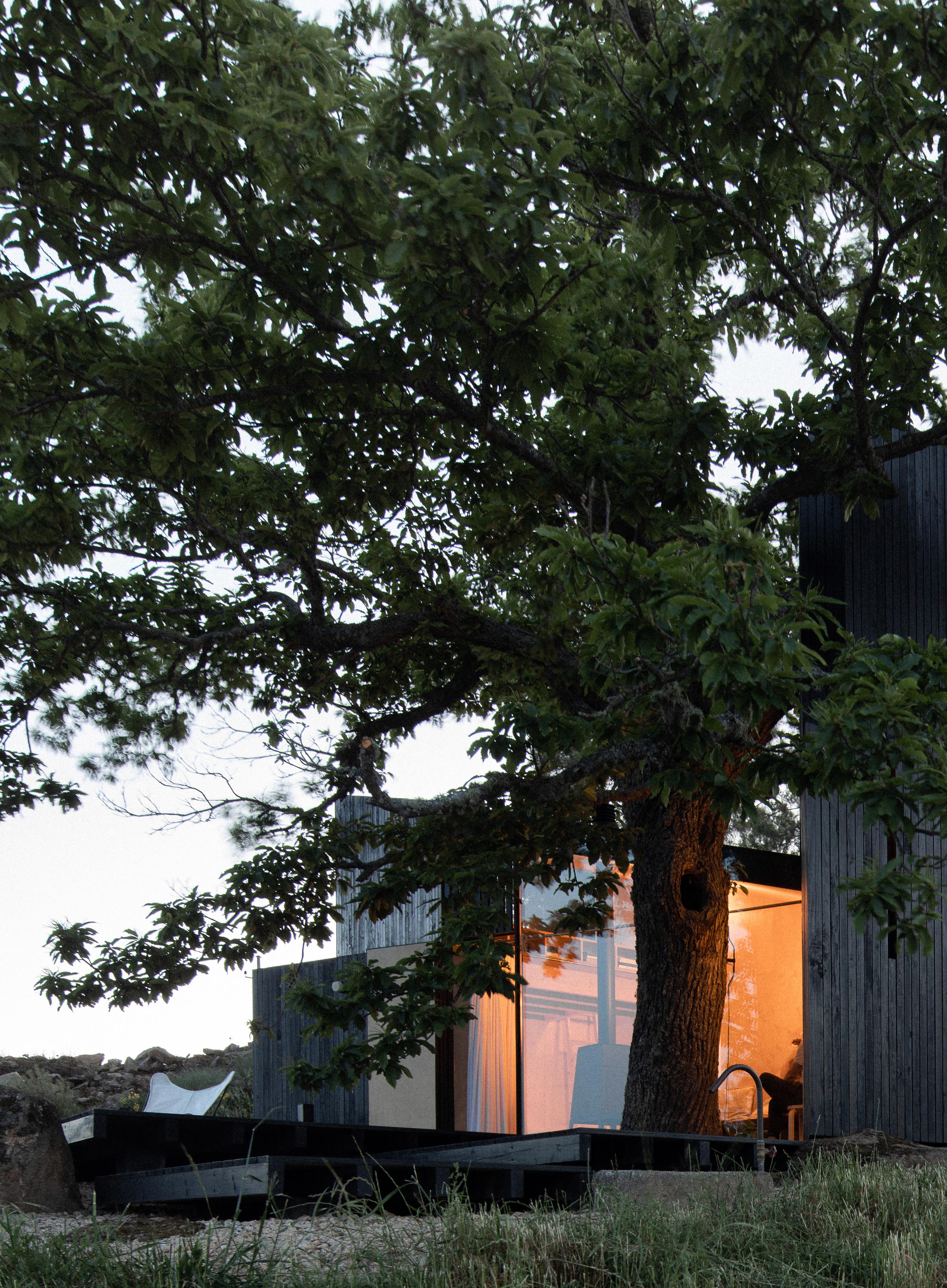 A zona de estar relaciona-se com o exterior através de um grande vão, prolongando o espaço interior para a plataforma em deck de madeira, de forma a sugerir a diluição da fronteira interior/ exterior e a promover a vivência ao ar livre. Não existe, propriamente, uma sala no interior, senão um espaço de mediação entre o interior e o exterior, já que a sala se localiza no exterior, sob a copa da árvore.
