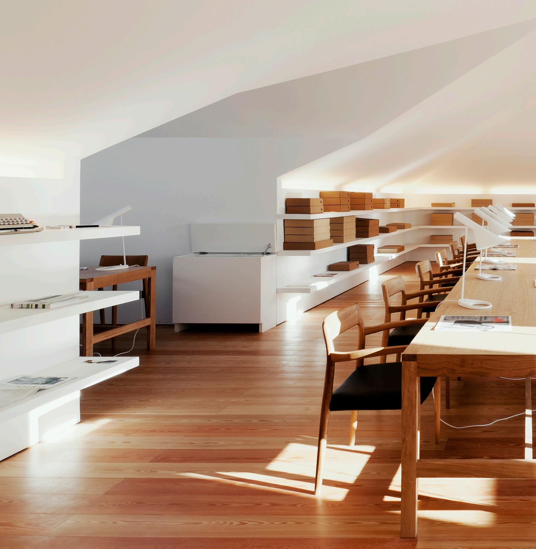The main purpose of the new intervention was to convert these installations into a Centre for Visual Arts. At the ground floor, a space for exhibitions was created. This space was designed to assume different configurations, achieved by the use of moving panels that reconfigure the space as long corridors or small rooms. The archaeological structures were preserved underneath the pavement that can be dismantled for easy access. New metallic stairs lead to the upper floor, which is divided in two by a structural wall. On one side, there is new built selfcontained wooden structure housing the laboratories, archives and the assembly rooms for photography. The exhibition rooms, the library and the offices are located on the other side. The ceiling has been removed as to unveil the master beams and other structural elements of the roof. Outside, the floor was levelled with a paving stone and the drainage line creates a sense of unity with the adjacent court - Pátio da Inquisição.