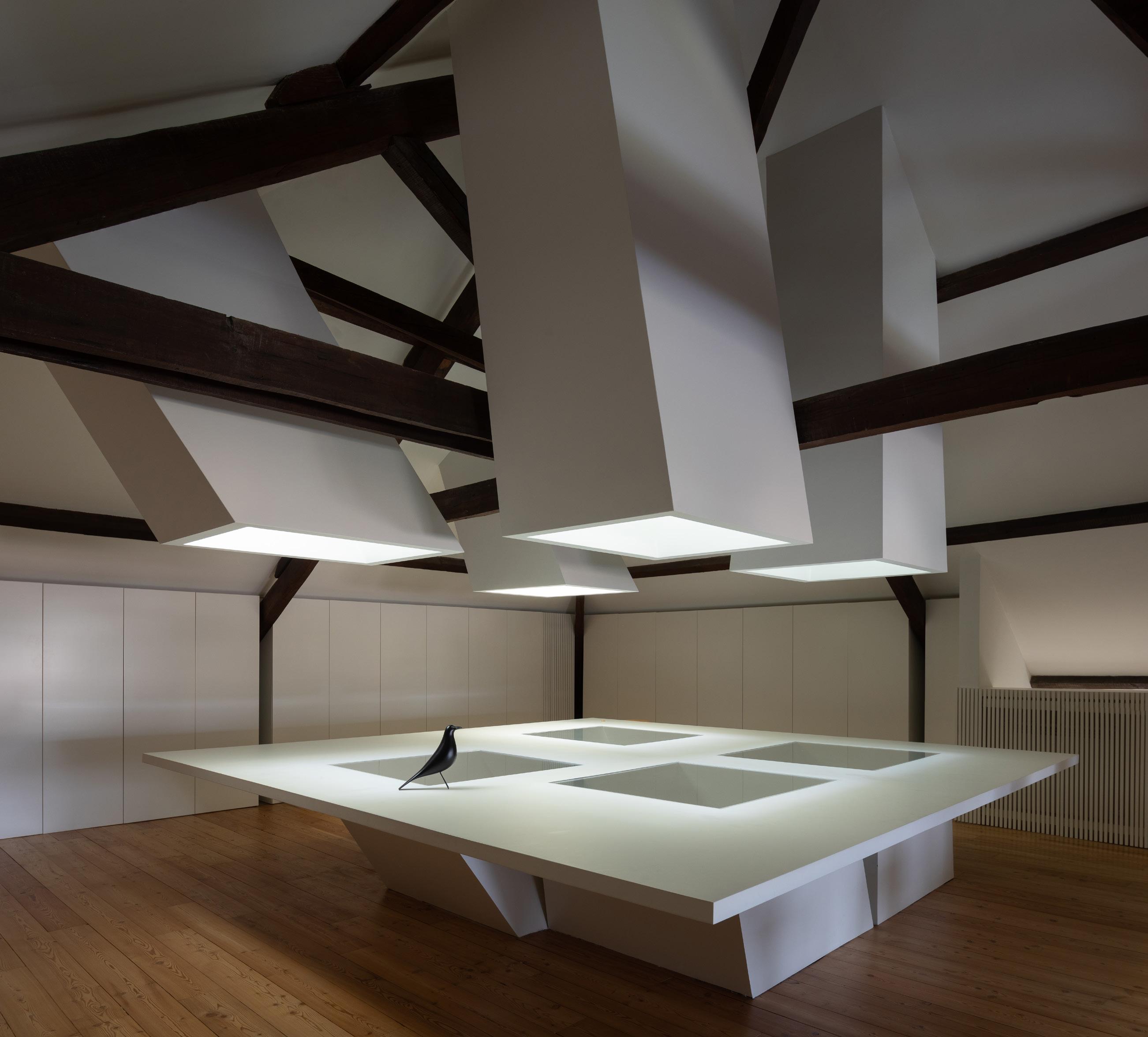 The North wing houses the main entrance, the bookshop and the reception. The new wooden staircase connects the main entrance with the second floor, where the library, dining, reading and exhibition rooms are located. From there one can access the garden or the South wing,