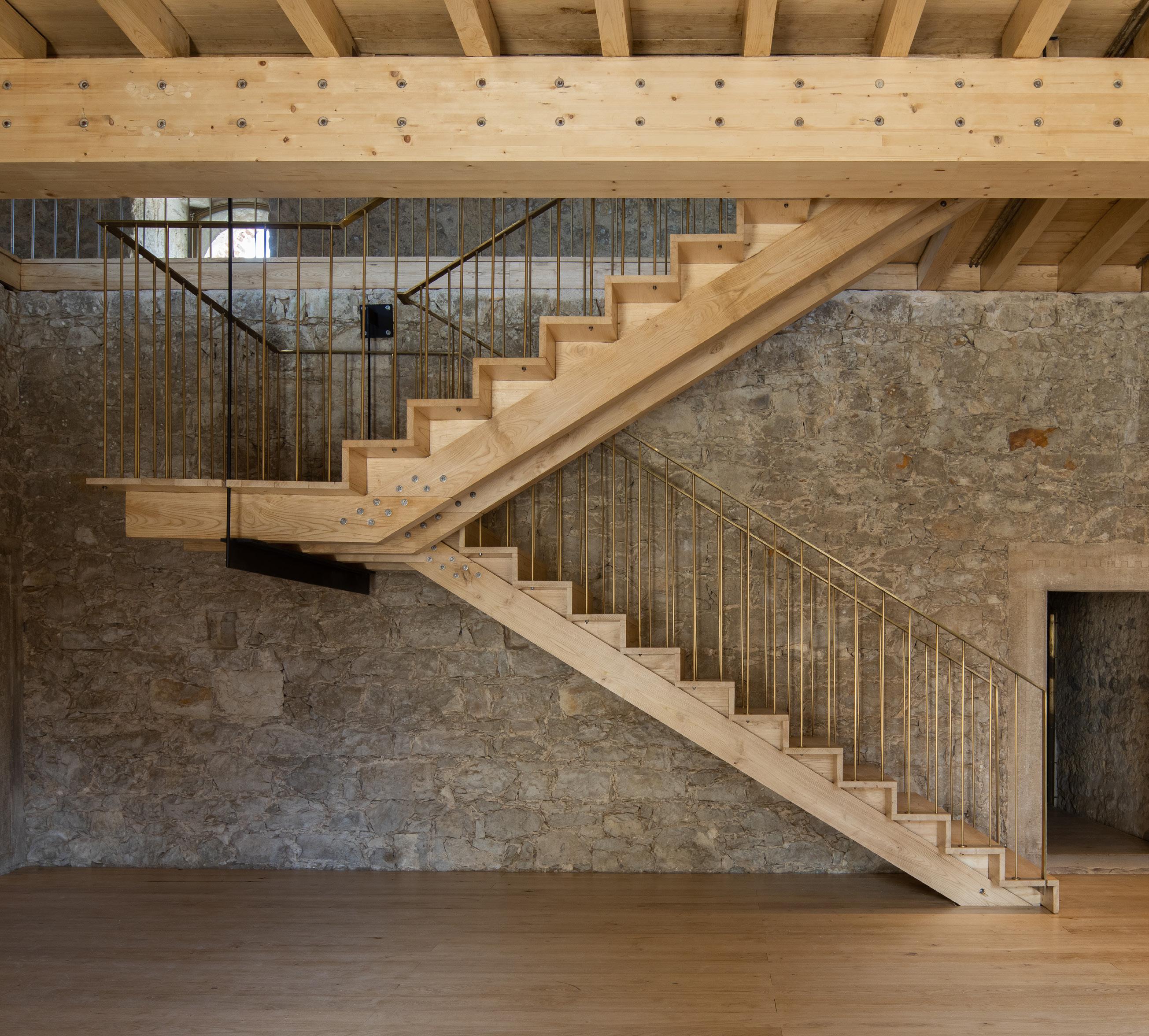 of installation avoids having to intervene in the walls, which are meant to remain untouched, without, however, reducing the flexibility of the future use of the space. The lighting system consists of pendant lights hanging from the ceilings, which do not affect the existing walls and accentuate the museological character of the building. The entrance space serves as a reception and filtering area, with access to two exhibition rooms to the east, a cloakroom to the south and the multifunctional space to the west. Access to the storage room in the basement, underneath the multifunctional space, is conditioned by and gained via a hidden staircase under a trapdoor. Access to the first floor, where there will be a large space for exhibitions or group events, is ensured by a new staircase made of chestnut wood, with brass railings and handrails. The intermediate landing of this staircase is suspended from a metal beam by means of two rods, and is secured to the existing wall and the new floor beam.