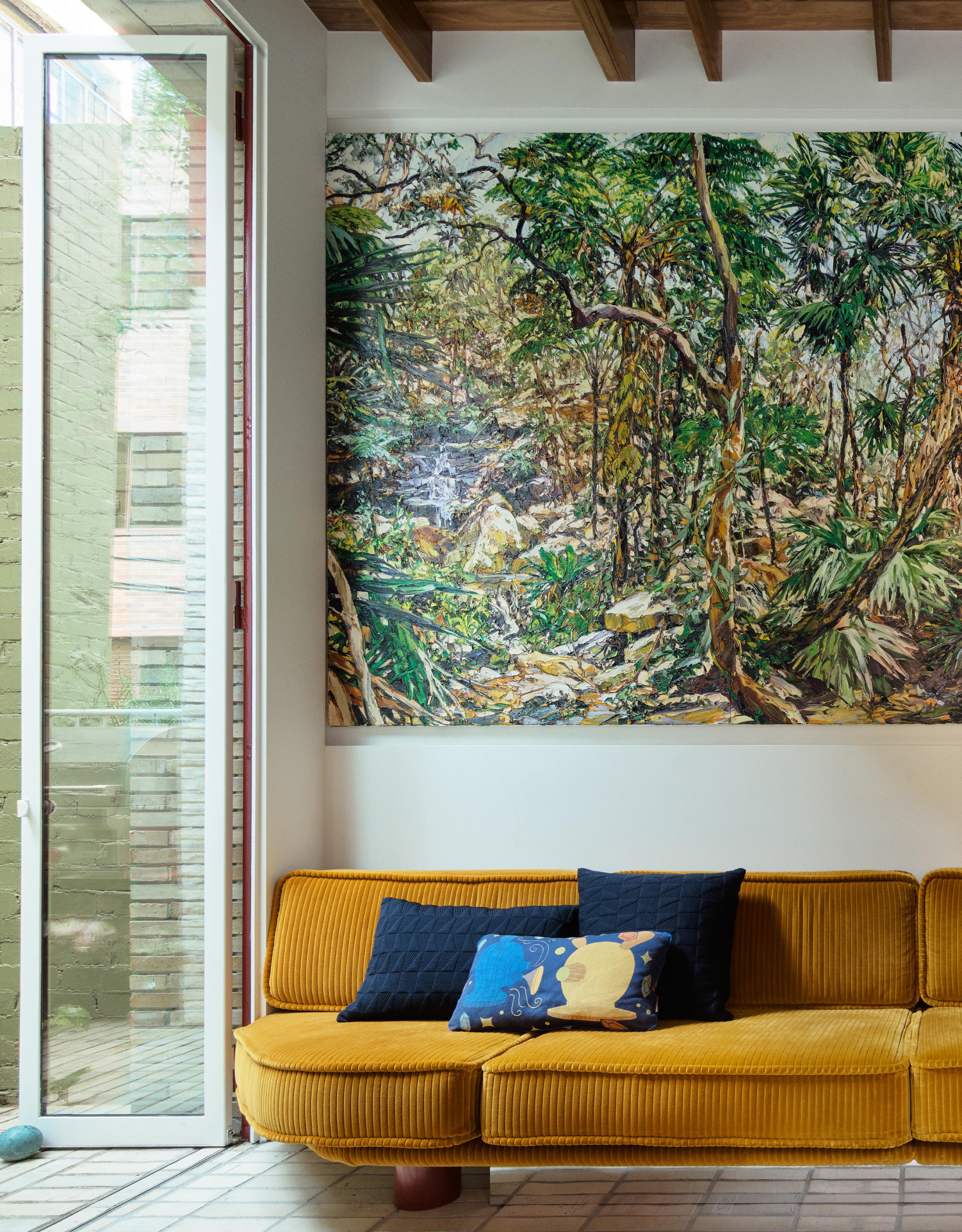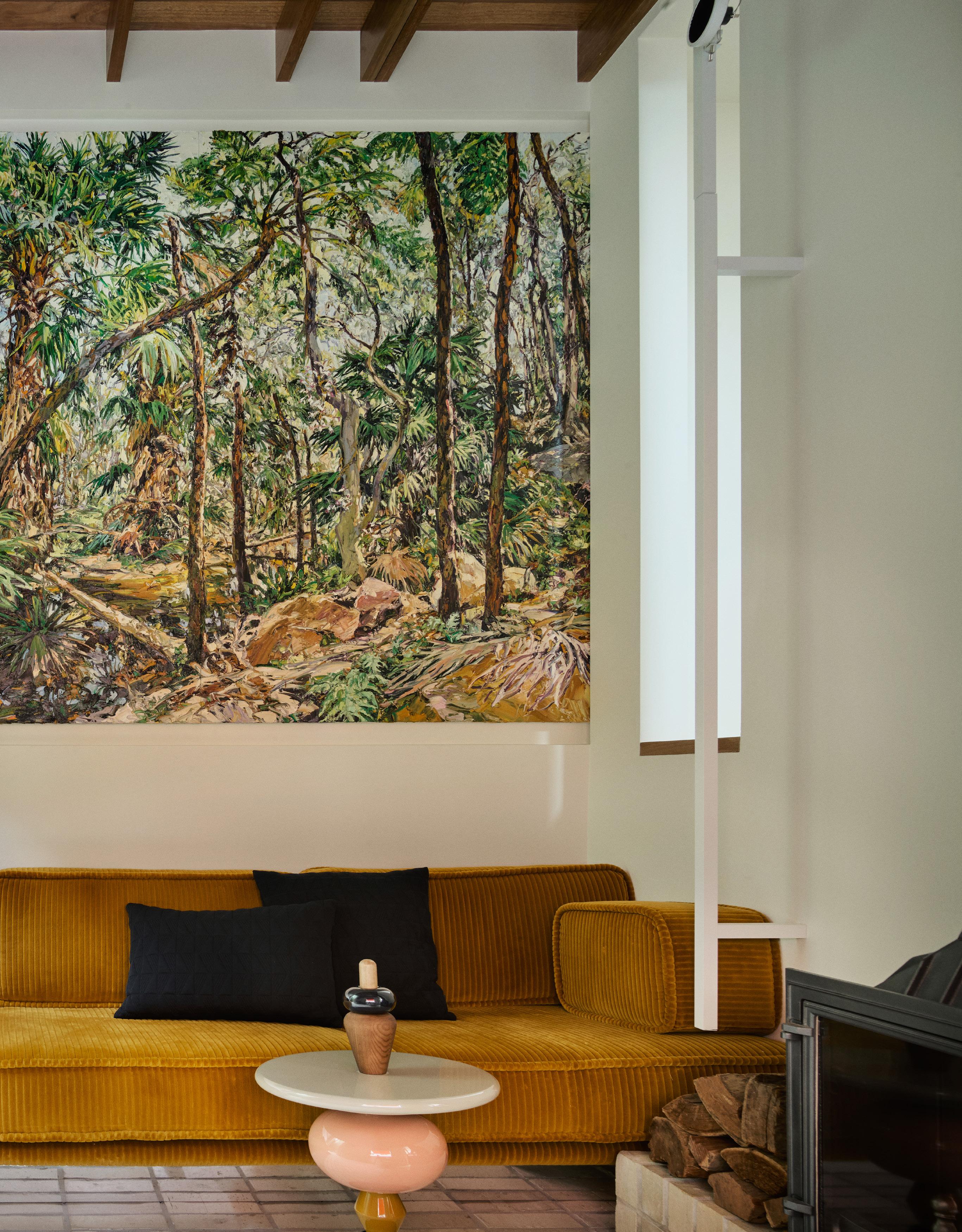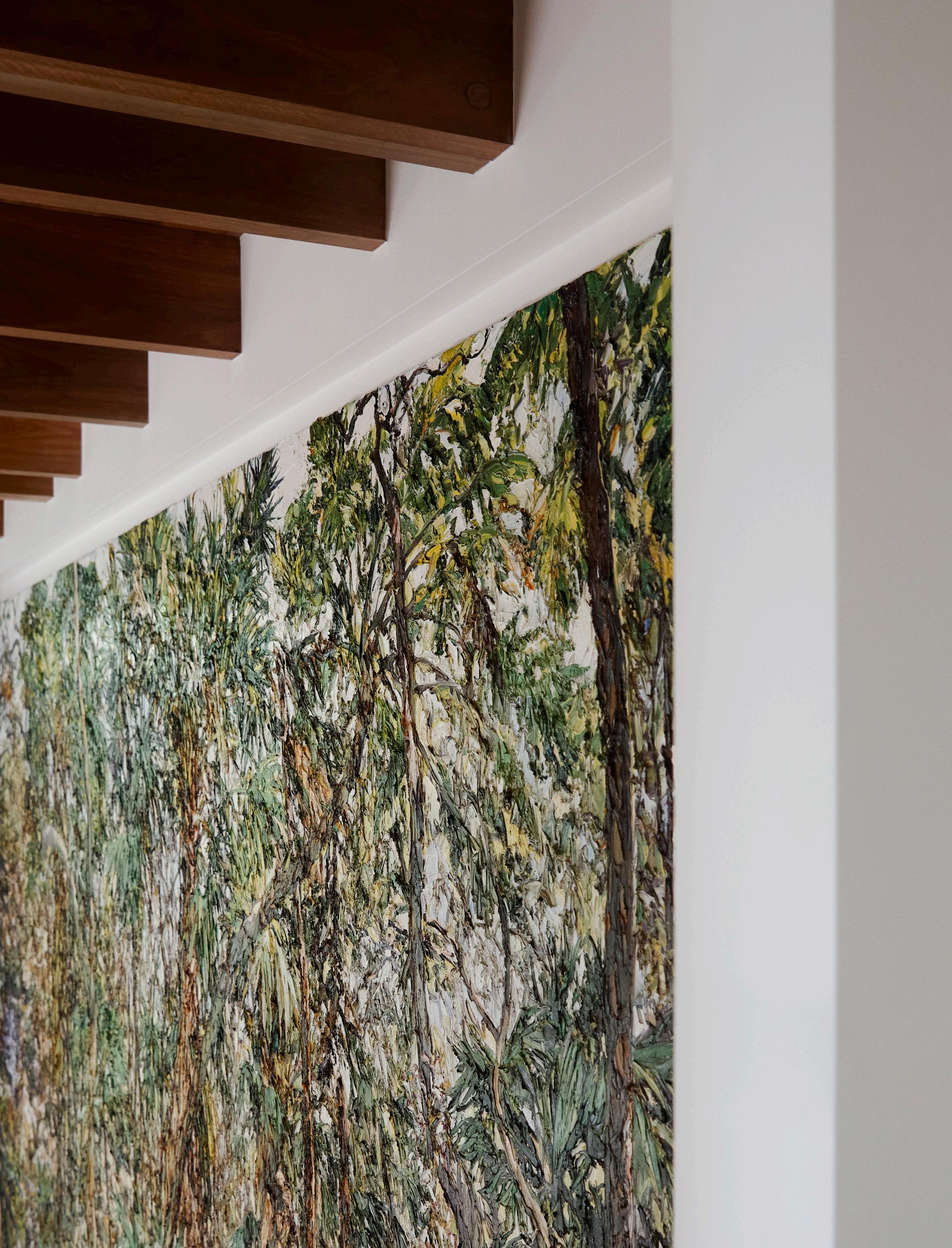 Through his representative gallery in Sydney, OLSEN, Harding agreed to undertake a 3.5 metre oil on canvas painting that would become a permanent fixture of the new dwelling. Together, clients and artist arrived at a brief for the painting, which was to express a vision of the place that was home to the clans of the Eora nation before white incursion.