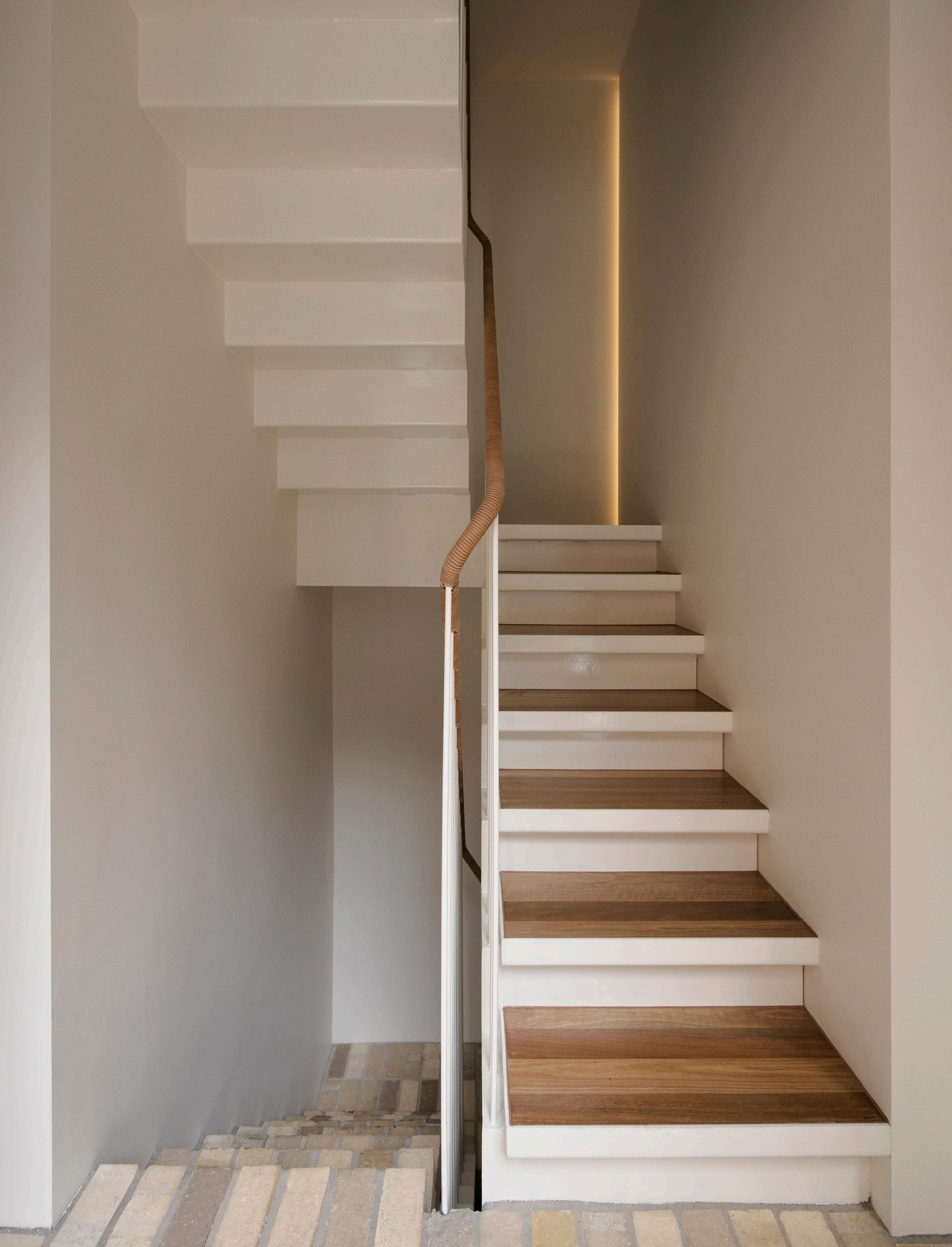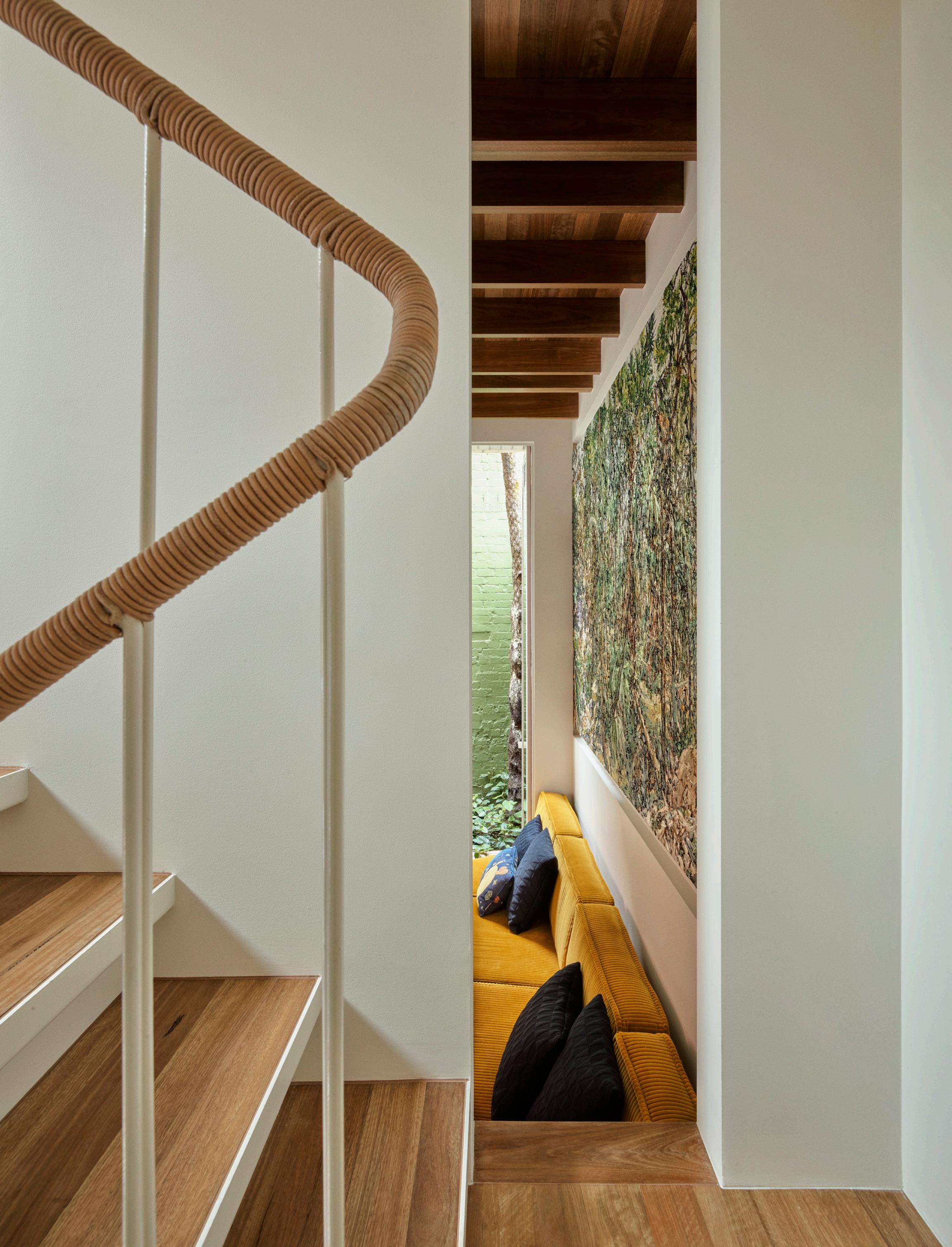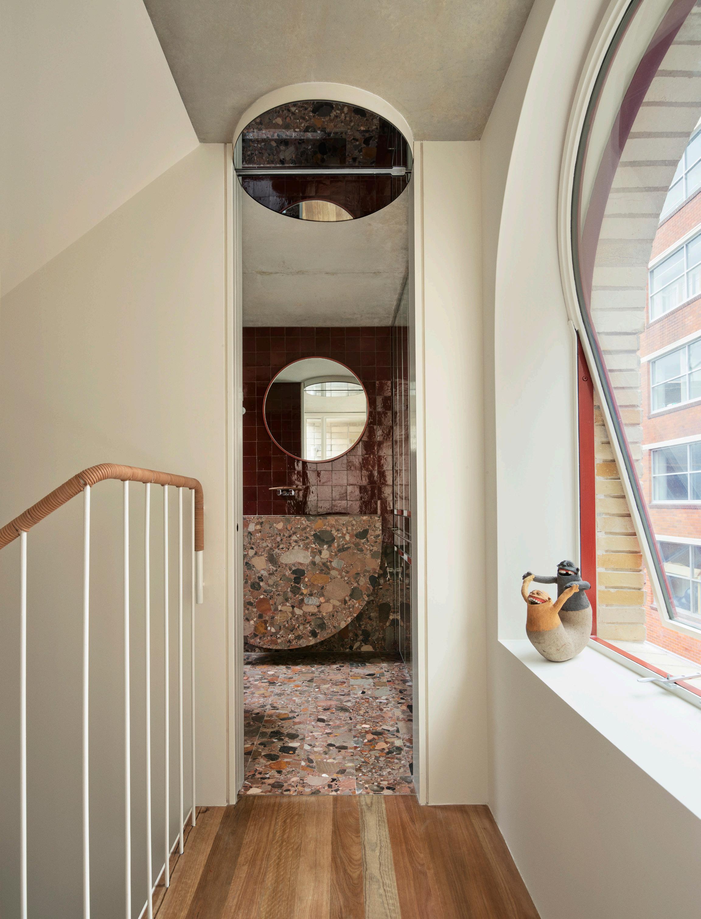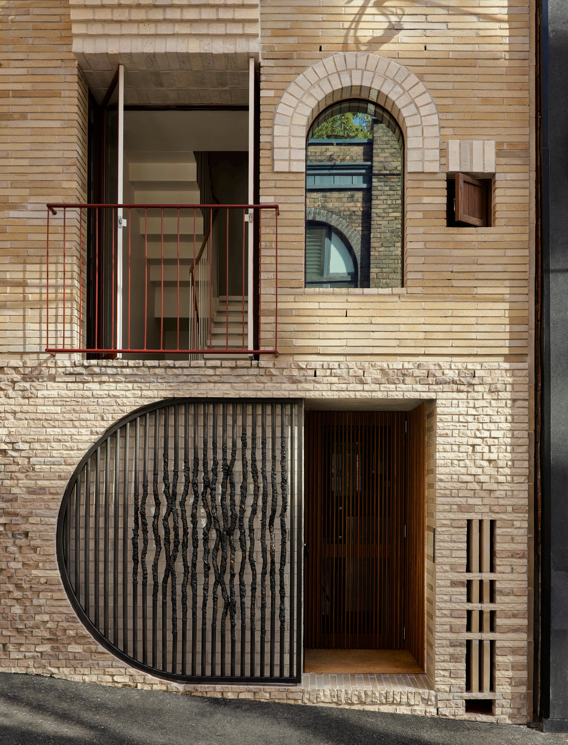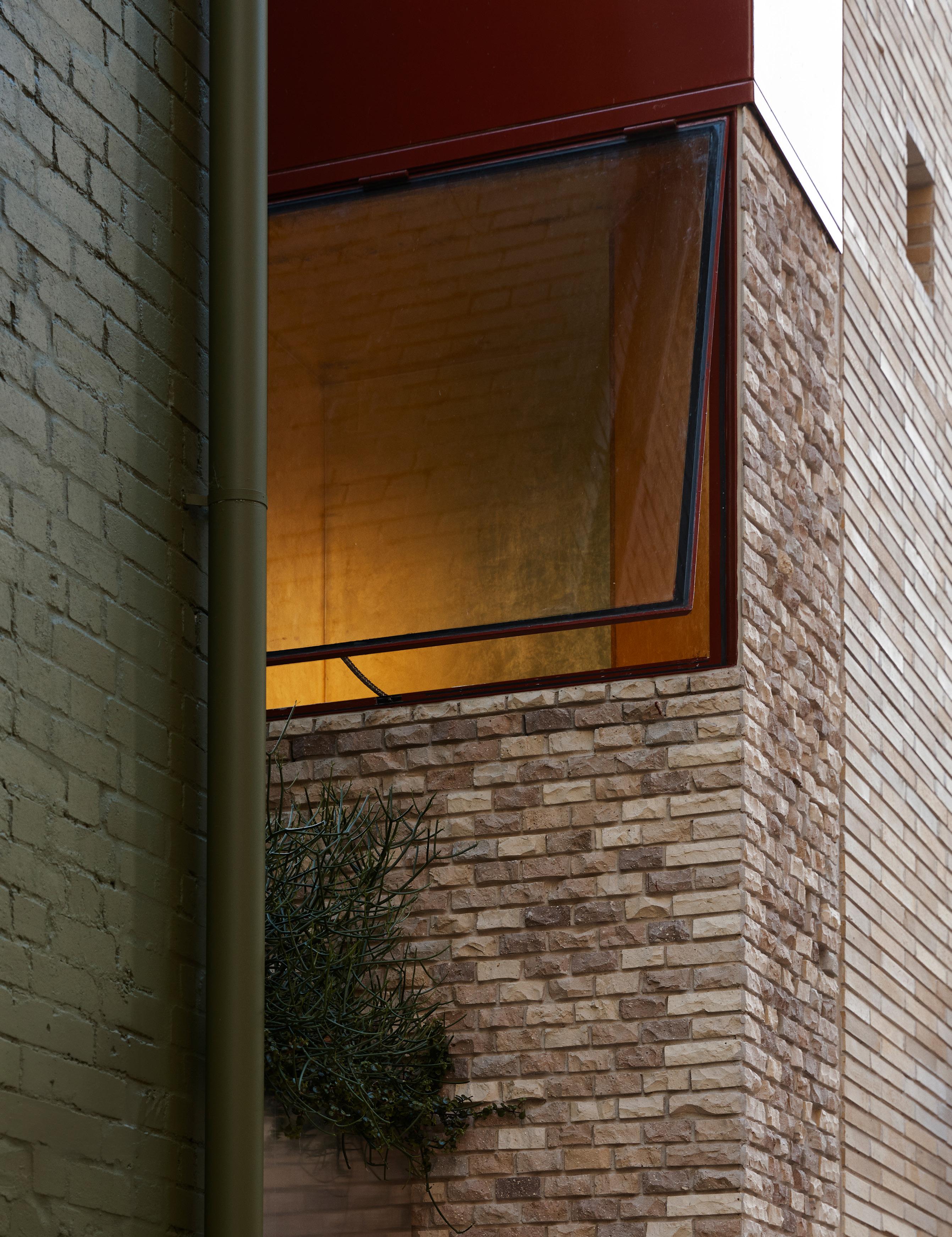 Perhaps the most striking feature of the dwelling is the apparently chaotic and exuberant configuration of openings. A series of fourteen unique openings are present on the main northern façade alone, perhaps a response to the necessary rationalisation of window and door types on multi-residential projects; of which the architect is an expert. Rather than a wilful composition, this is a result of rigorous consideration of the capacity for each opening to enhance its room; the arched kitchen window perfectly framing an arched window to the neighbouring building across the lane, the axial viewpoint controlled by virtue of the perpendicular kitchen aisle; the vertically-proportioned living room window