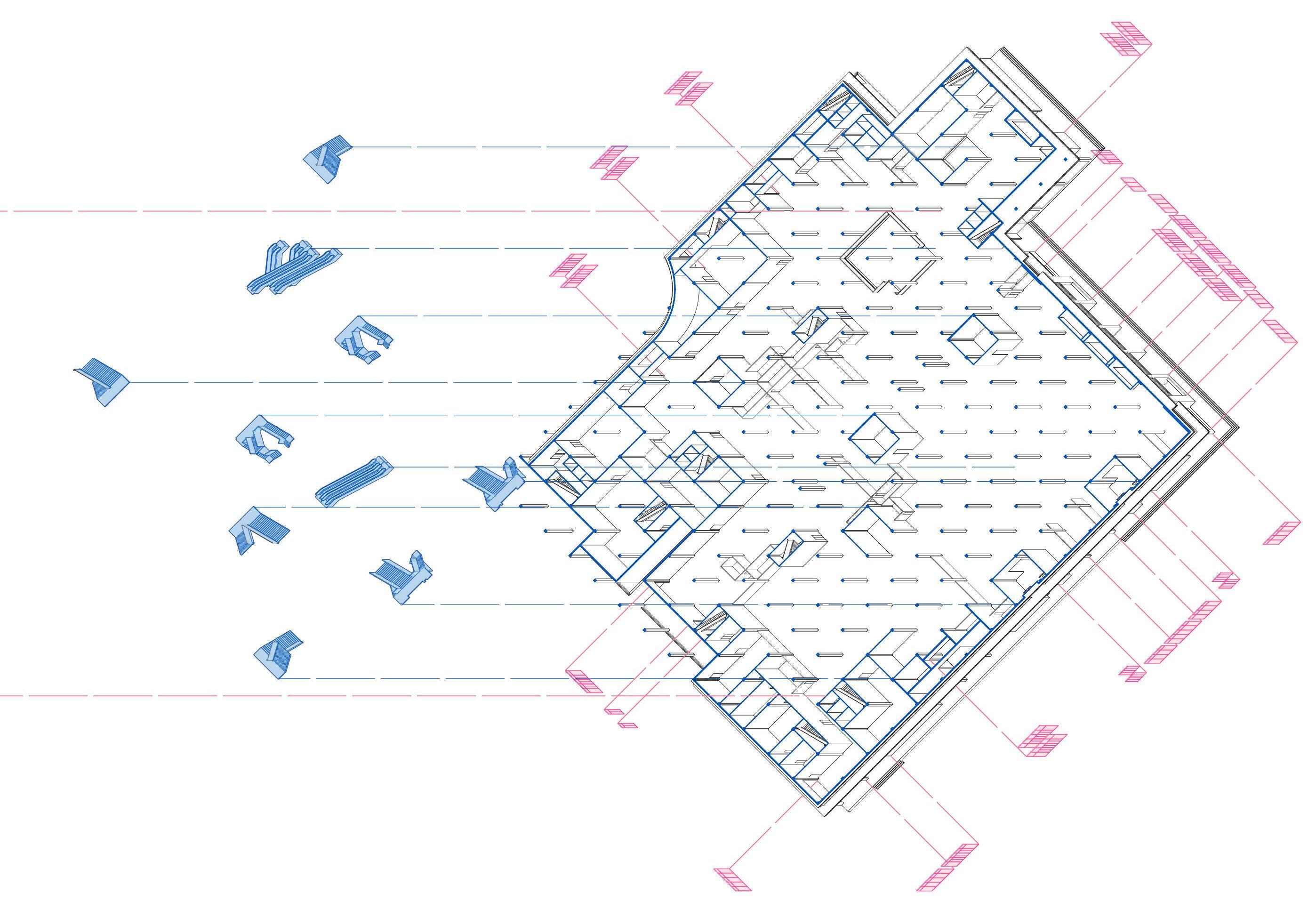 Fig 073. Wangfujing Department Store, ground floor, disassembled architectural elements, axonometric drawing, 1955, 1997, 2007. Drawn by author.