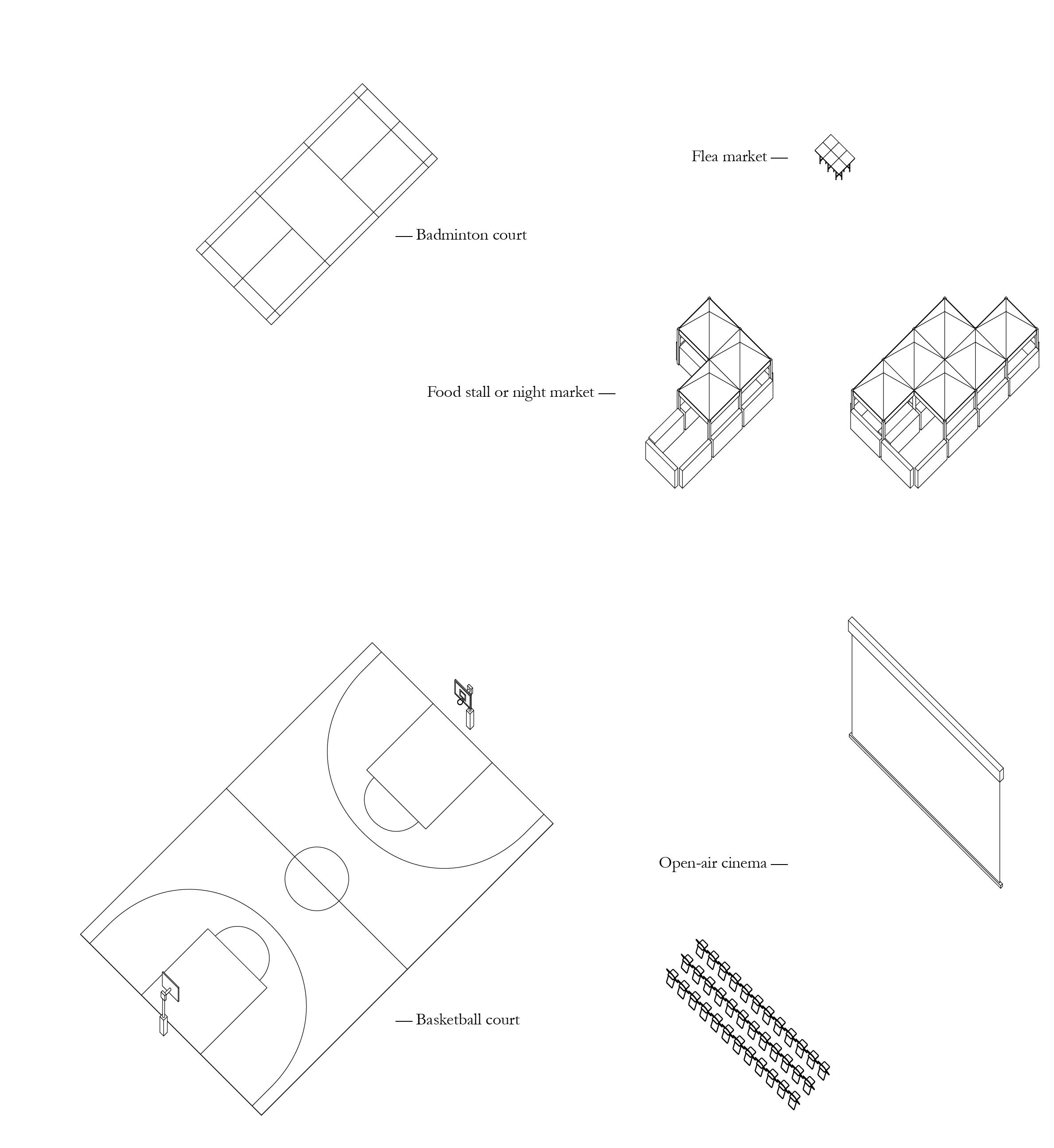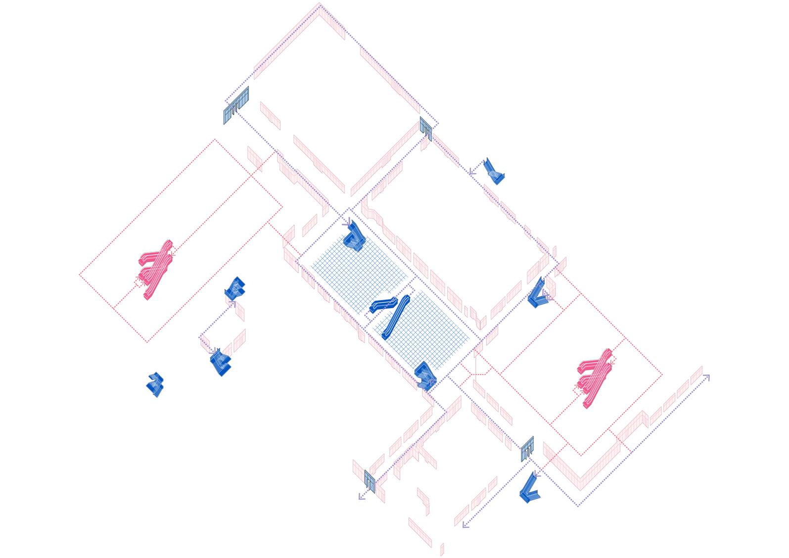 By analysing and learning from interior architectural elements that shape the social attributes of the mall typology, such as vertical circulation and atrium, the project tests the instrumentality of these elements in the context of today’s shopping spaces in Beijing, including the outdoor system of overpasses and platforms, as existing materials for collective commercial design, aiming to form spatial organisations capable of shaping social aggregation. At the same time, learning from existing informal daily commercial activities, such as flea markets and food stalls, ensures that the new public program conforms to the urban territorial conditions of the Beijing city. By exteriorising the mall circulation in reverse, the project enhances the community cohesion and balance between multiple user identities, creating a collective urban living space that promotes public consumption and interaction.