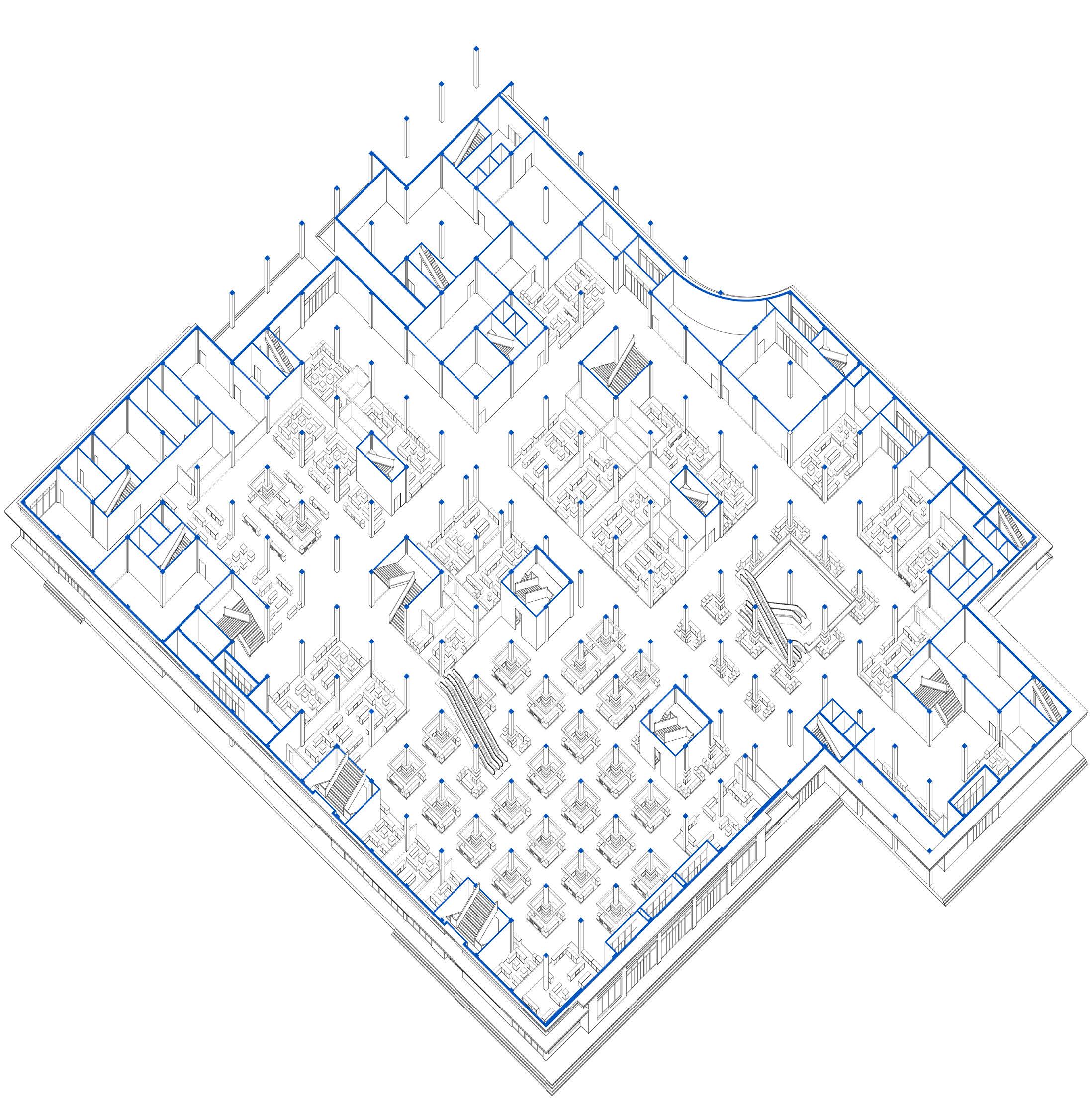 Fig 074. Wangfujing Department Store, ground floor, integral spatial organisation, axonometric drawing, 1955, 1997, 2007. Drawn by author.