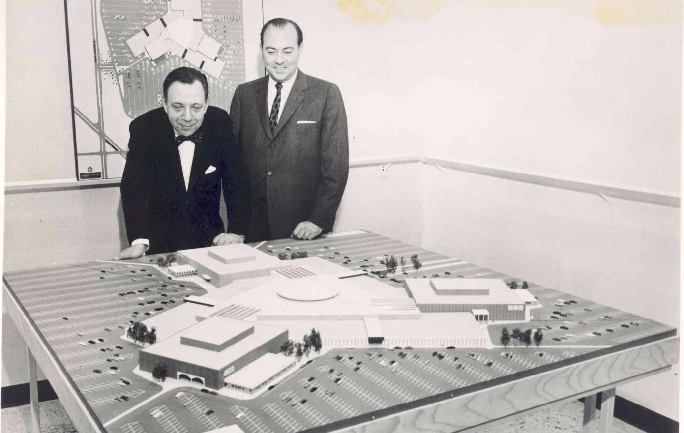 Fig 6.3. Randhurst Mall, Mount Prospect, Illinois, photo of model with Victor Gruen (left) and George M. O'Neill, 1962. From Randhurst: Suburban Chicago’s Grandest Shopping Centre.