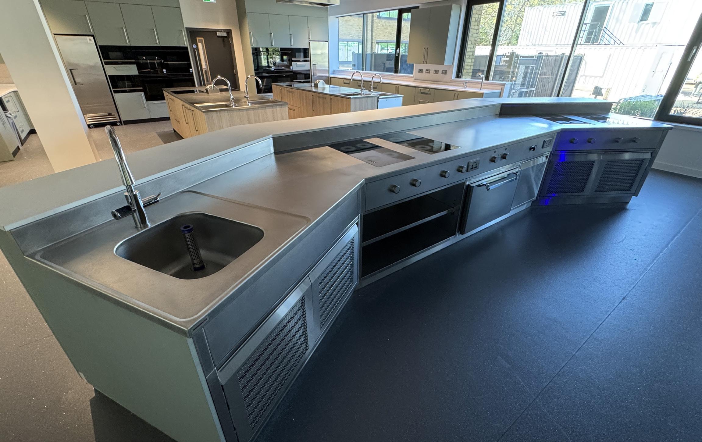 Sitting pride-of-place in the development kitchen of one of the world’s biggest food manufacturing brands, this bespoke, stainless-steel island incorporates all of the elements required to adequately test, demonstrate and finish food products. This is made possible by integrating various elements such as a Menu System Multifunction/Multipan Induction Hob with two coils and cooking surfaces and GN2/1 Electric Oven. Completed with elements such as an integrated sink, double door cupboards, and a plush shopfitted counter with decorative fascia, this cooksuite is both visually impressive and practical.