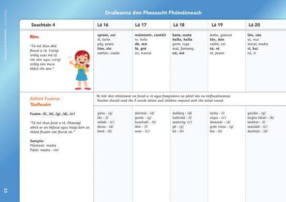 fhónaic, tá an clár deartha chun torthaí foghlama a chomhtháthú thar na trí ghnéithe uile den churaclam: ‘Teanga ó Bhéál’,‘Léitheoireacht’, agus ‘Scríbhneoireacht’. Sa chlár seo, cinntítear cur chuige lánchumsitheach i leith litearthachta, rud a chabhraíonn le foghlaimeoirí