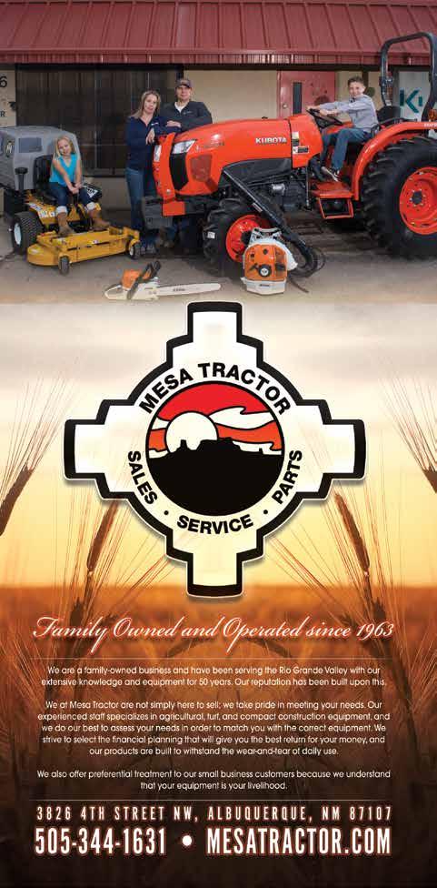 APRIL 2023 | ALBUQUERQUE THE MAGAZINE 165 Reliability comes in all sizes. Rugged versatility is what makes Kubota tractors the perfect choice for getting every job done right. Visit us today for a test drive. L Series MX Series B Series BX Series KubotaUSA.com © Kubota Tractor Corporation, 2020. This material is for descriptive purposes only. Kubota disclaims all representations and warranties, express or implied, or any liability from the use of this material. For complete warranty, safety and product information, consult your local Kubota dealer. For the complete disclaimer, go to KubotaUSA.com/disclaimers and see the posted disclaimer. Mesa Tractor, Inc. 3826 4th St NW Albuquerque, New Mexico 87107 505-344-1631 Reliability comes in all sizes. Rugged versatility is what makes Kubota tractors the perfect choice for getting every job done right. Visit us today for a test drive. L Series MX Series B Series BX Series KubotaUSA.com © Kubota Tractor Corporation, 2020. This material is for descriptive purposes only. Kubota disclaims all representations and warranties, express or implied, or any liability from the use of this material. For complete warranty, safety and product information, consult your local Kubota dealer. For the complete disclaimer, go to KubotaUSA.com/disclaimers and see the posted disclaimer. Mesa Tractor, Inc. 3826 4th St NW Albuquerque, New Mexico 87107 505-344-1631