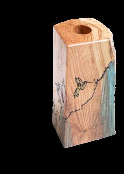 Handcrafted by local artists Ron & Krisann Quintana from local and domestic woods, this one-of-a-kind conversation starter is eye-catching in its own right, and has the space to hold small flowers.