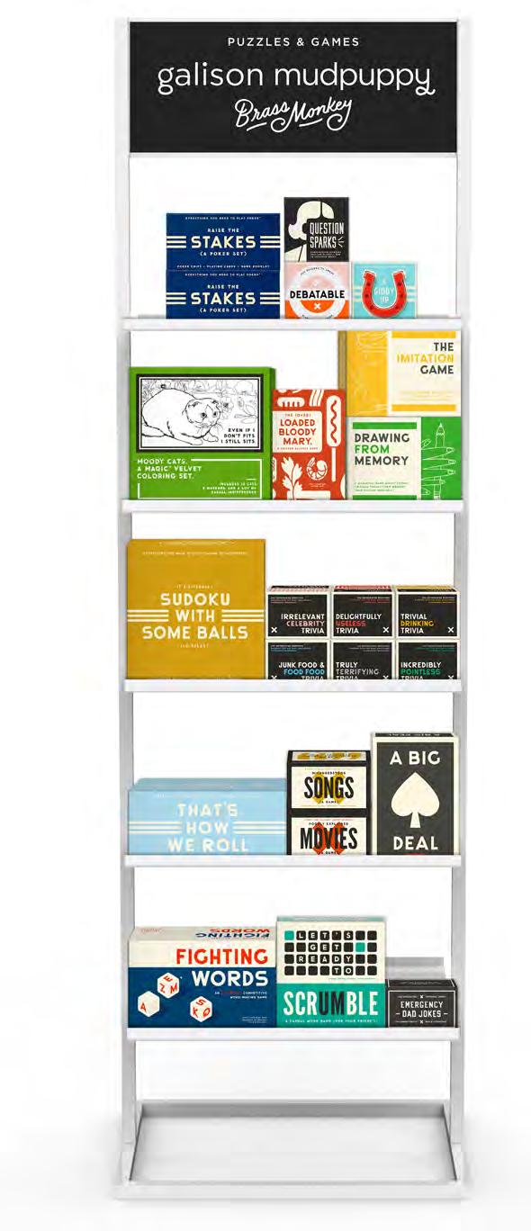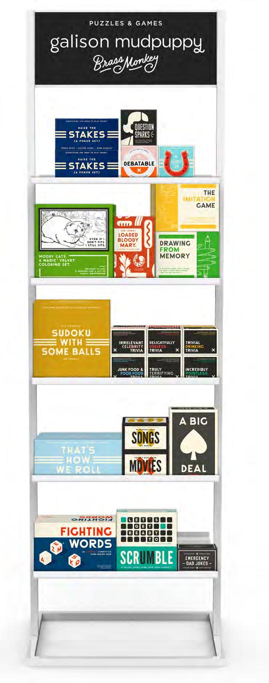 Our well-designed rack is the perfect solution to showcase approx 70-80 Brass Monkey units. And this white powder coated metal shelving tower provides for a wide assortment of product that can be merchandised from both sides.
