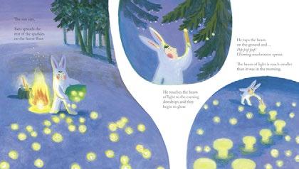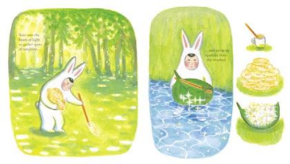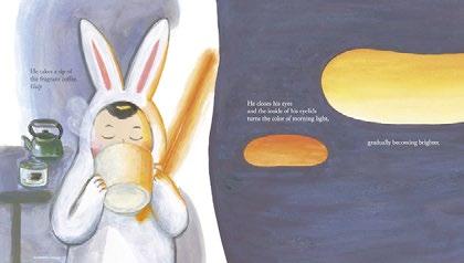 Every morning, Sato the Rabbit opens his eyes to the soft light of day, ready to embrace all that the universe has in store for him. One day, the shining morning light that peeks out from his curtains becomes a bar that transports him to a forest, where he gathers dappled sunlight into a warm fire and sets the night dew aglow. Another day, Sato wakes up to find his room transformed into a lighthouse floating on the big, wide ocean, where he scoops up the light that comes through the colorful glass windows to create a special signal that ushers in fish and seabirds bearing wonderful treats.