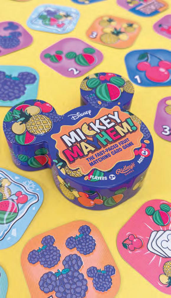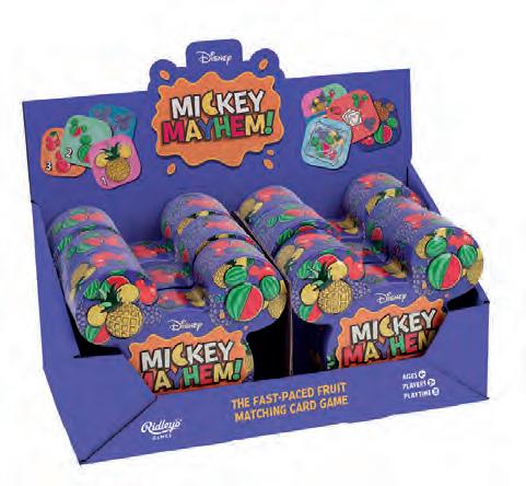 SPLAT! It’s time for fruit-filled fun with the world’s most recognized icon: Disney’s Mickey Mouse! This card-matching game is frenetic, and things could get messy, but you’ll create memories that last a lifetime. Includes 64 Mickey Mouse Fruit cards, 4 Fruit Mix-Up cards, 4 Freeze cards, 3 New Basket cards, 1 Clear Hand card, and EFIGS instructions. Printed using FSC paper and soy inks, the game comes in a Mickey Mouse-shaped tin that is recyclable.