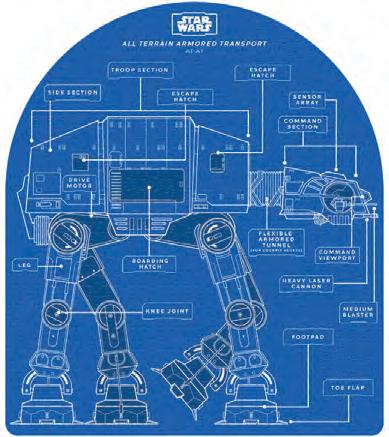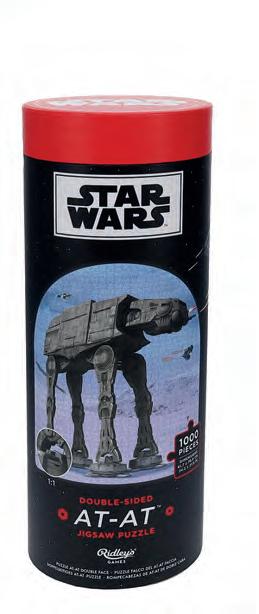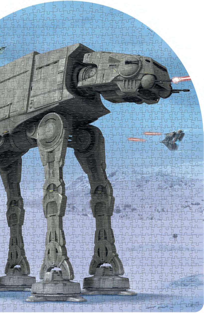 Double-sided 1000-piece shaped jigsaw puzzle. Features the iconic scene of an AT-AT combat vehicle battling Snowspeeders™ on the ice planet Hoth. On one side is a full-colour image of the AT-AT exterior, on the other side is a schematic blueprint of the machine with key features labelled. Includes poster guide. Packaged in paper bag inside a card tube sealed with paper tamper seals, this is plastic-free. Ages 8+.