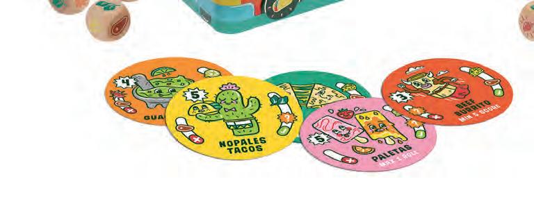 In this spec-taco-lar dice-rolling, push-your-luck game, you’ll be at the edge of your plate as you roll the dice to collect delicious dishes! The aim is to win tasty food cards and drinks by rolling the ingredients that match the dish you’re trying to make. Includes 32 Food cards, 12 Drink cards, 8 Ingredient dice, and instructions. Printed using FSC paper and soy inks.