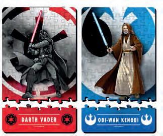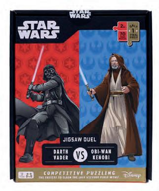 Who will claim victory in this Star Wars Jigsaw Duel: Obi-Wan Kenobi or Darth Vader? In this innovative competitive game, you and your fellow puzzler each have a 70-piece jigsaw to complete—but there is only one final piece that fits both puzzles. The first person to put their jigsaw together and grab the final, double-sided piece wins the battle! Includes 2 x 70-piece jigsaw puzzles, wooden stand, and EFIGS instructions.