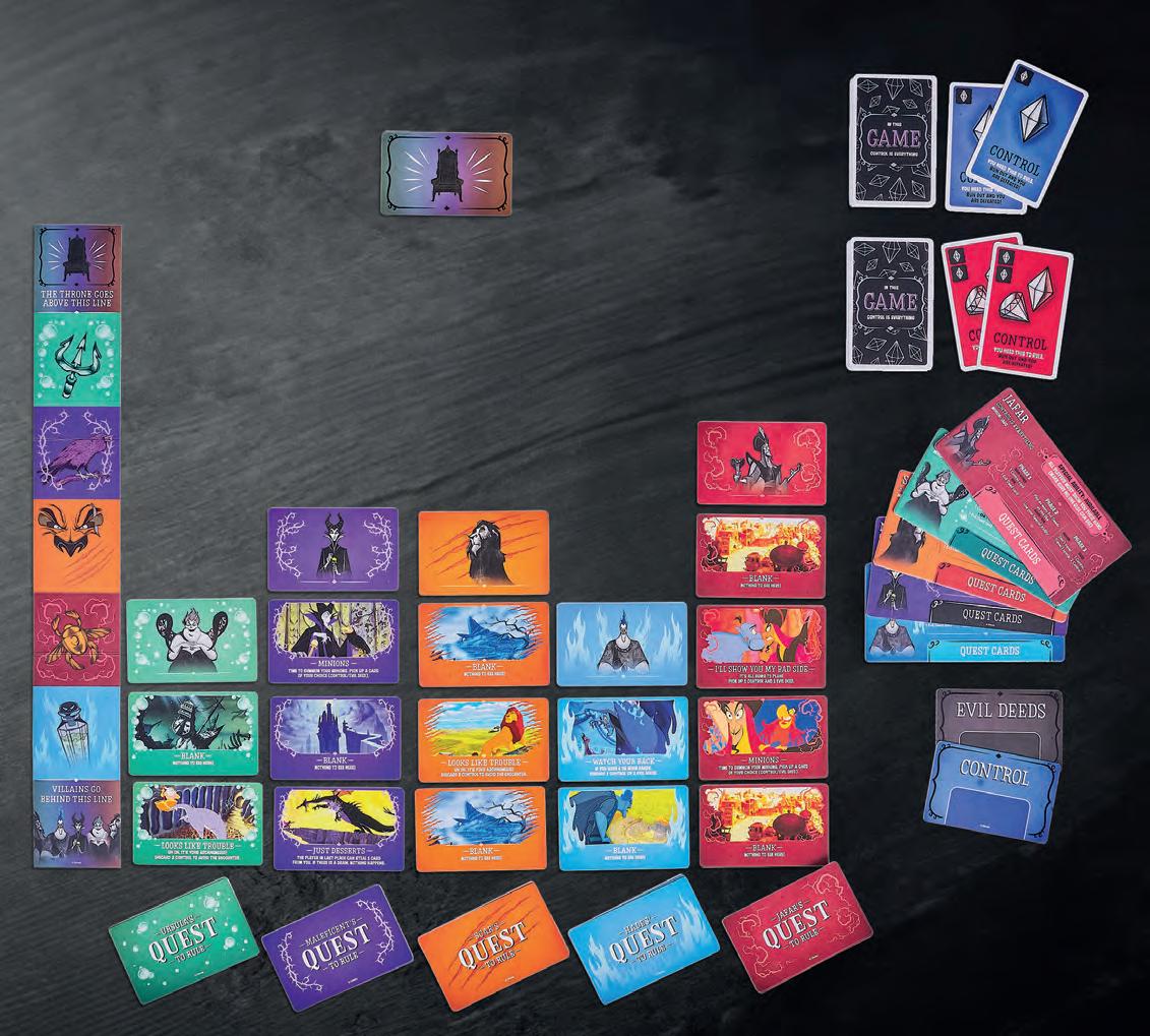 Utterly villainous behavior is required if you want to be the ultimate Disney Baddie and seize the throne! This wicked light-strategy card game is a race to complete your personal quest and take your rightful place as Evilest of Them All. Includes 70 Quest cards, 48 Control cards, 30 Evil Deed cards, 5 Player cards, 1 Throne card, 5 player mats, 1 guide strip, and instructions.