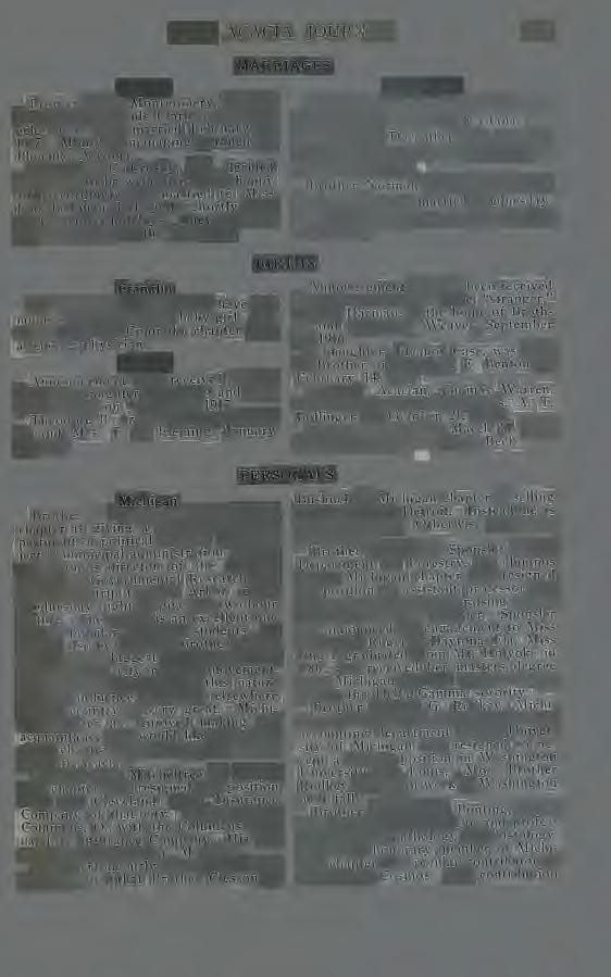 Announcement comes of th e marriage of Brother D W. Aughenbaugh to Miss Edith Lan e of Long B eac h, Cal. Grand Co uns e lor Woodward mad e hi s annual visit to Colorado Chapter on March 4th. Initiation wa s h e ld that a ft e rnoon for Broth e r Eugene B. Webster and Brot h er William J Steinmetz was initi a te d in th e evening. Broth e r Woodward was accompani ed b y Brother C T Bushn e ll of Michigan Chapter, who is now located in Denver.