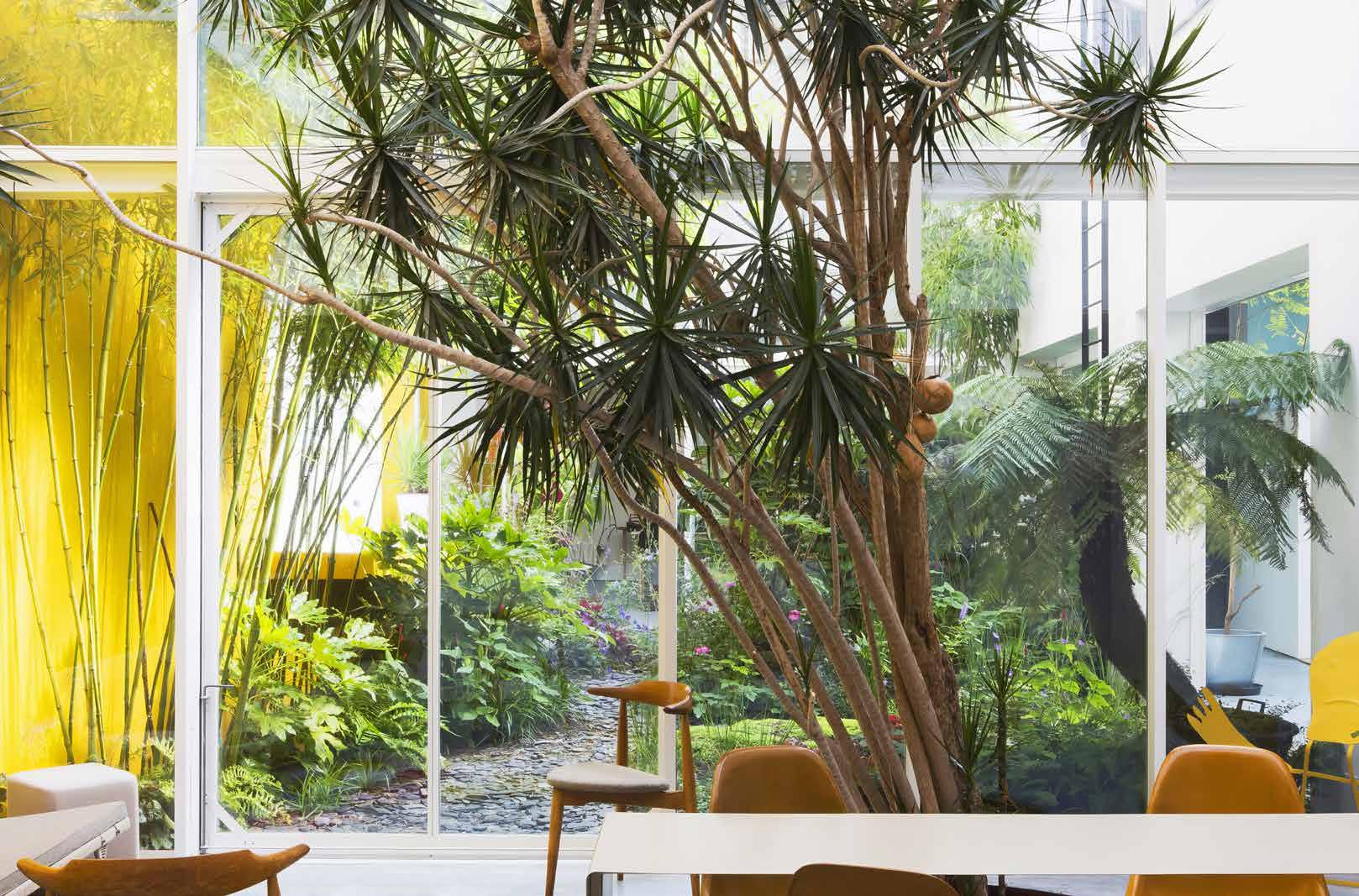 Our intention was to create a lush, vibrant look and blend the beauty of the garden with the interior and vice versa. To blur the line between indoor and outdoor living and emphasise the connection between the different functions, the house’s bright yellow-painted walls extend seamlessly into the garden. The same applies to the concrete paving combined with shale chips. The house has been fitted with floor-to-ceiling sliding doors. When they are open, the barrier between inside and outside disappears. The eye-catcher is the dramatic Dracaena marginata or Madagascar dragon tree growing out of the concrete floor in the kitchen. It was planted using a crane, after which the glass roof was installed above it.