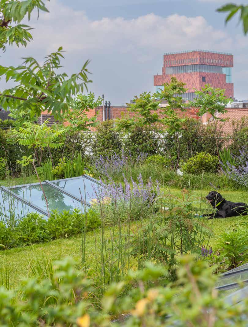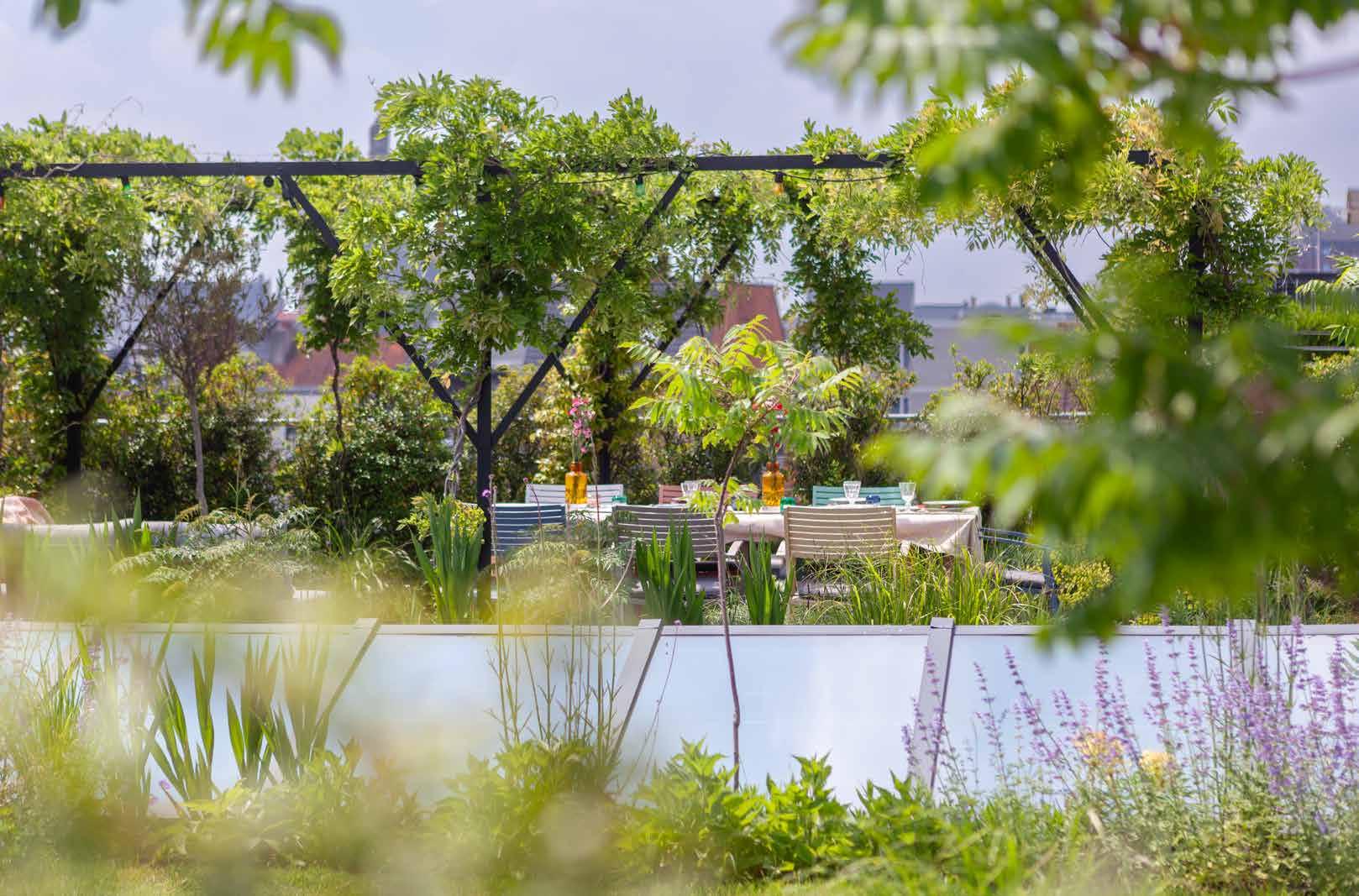 There is lots of sunshine to be had here, like on all roofs. However, it also means that you cannot sit in the garden if there are no shaded areas. At the client’s request, we therefore built a large steel pergola overgrown with wisteria (Wisteria sinensis) to provide shade so the client could eat outside. False holly (Osmanthus burkwoodii ) hedging serves as a balustrade. Bamboo sticks were woven into the hedge for added safety to ensure that even the dog would never be able to make it through the hedge.