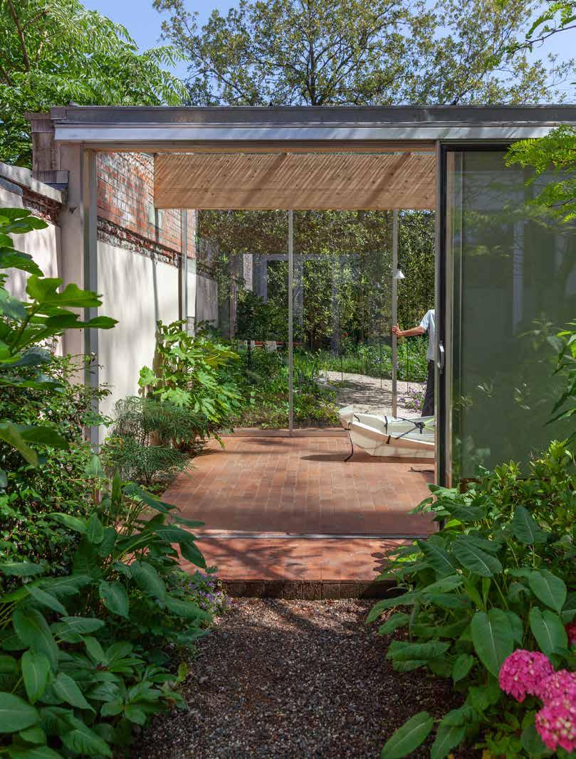 We added a tall rhododendron with fuchsia flowers, tree ferns and cypress trees to create a lush, green oasis. We managed to create some sense of privacy between the winter living area (conservatory) and the neighbours on the left with a cluster of evergreen yews and Carpinus betulus. The plants in the central borders are very diverse, offering lots of variety in terms of shape, scent and colour throughout the year. We camouflaged the walls with various climbers, including evergreen Tuscan jasmine (Trachelospermum jasminoides) and Algerian ivy (Hedera ‘Gloire de Marengo’ ), combined with deciduous species such as wisteria (Wisteria sinensis), Clematis ‘Étoile de Hollande’ and Boston ivy (Parthenocissus t. veitchii ). We chose castle gravel for the paving because it is a nice match with the terracotta tiles of the two winter gardens.