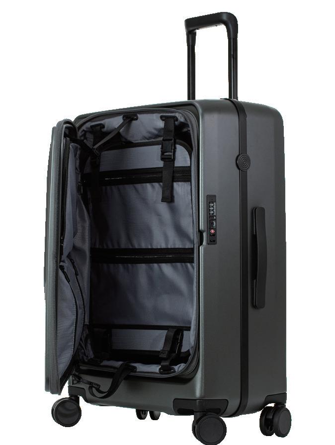 Quick access Compartment Main compartment opens wide for easy and organized loading. Trolley handle pass-through for stacking atop luggage.
