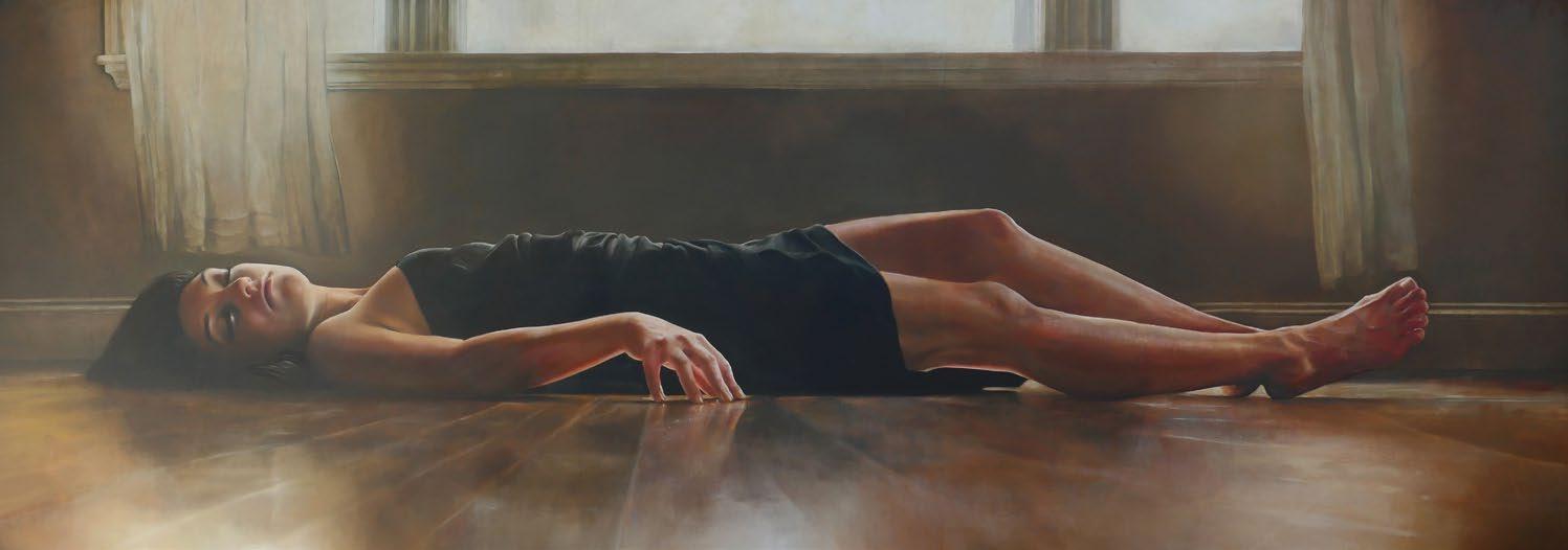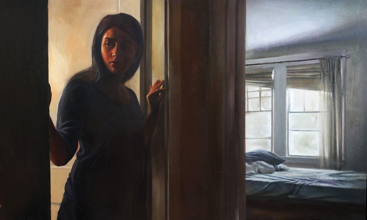 Farzaneh and Bahareh Safarani were born (1990) and raised in Tehran, Iran, and are collaborative twin artists. They have been painting together since they were thirteen years old, and continue to work inseparably. After training under Farimah Farhatnia, the sisters studied painting, performance, video, installation, conceptual art, and poetry at the University of Tehran. Recently, they received their Masters degrees in Studio Arts from the College of Art, Media & Design at Northeastern University and the School of the Museum of Fine Arts, Boston. They have shown their work extensively in the United States and internationally in solo and group shows, including the German Embassy, The Massachusetts State House, Yuan Art Museum in China, and various galleries. The solo-exhibition at Adelson Galleries Boston, Projecting Her, will feature Farzaneh and Bahareh’s innovative video projections onto painted canvas. The two create stunning and dramatic compositions of one another within dark interiors. The paintings by themselves are uniquely beautiful. However, in this new body of work, the artists have projected videos of figures walking through the interiors they depicted on canvas. The effect is visually stimulating and adds even more depth to the narratives in paint. The subject matter seems to allude to a conversation about identity. Not only are the identical twins raising questions about personal individuality, but they also call attention to their identities as Iranian women – often depicting a black cloth or burka, slightly covering their nude bodies. The gallery will be transformed into an immersive space, inviting viewers to participate with the thought-provoking installations.