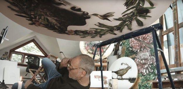 Steven Spazuk’s unique medium catches people’s attention, and his subject matter allows a quiet moment of reflection about current world issues. Spazuk fills his works with symbolism or subtle narratives that display his impassioned ecological or social sentiments. Almost all of the artworks in this exhibition contain an image of one of humankind’s most destructive inventions: the firearm. Guns – infused with flowers – are referential to domestic shootings as well as humanity’s often violent relationship with the natural world. The artist’s approach to these controversial topics are neither vindictive nor are they meant to be chastising to gun owners; instead, the compositions are reminders to all that beauty, love,