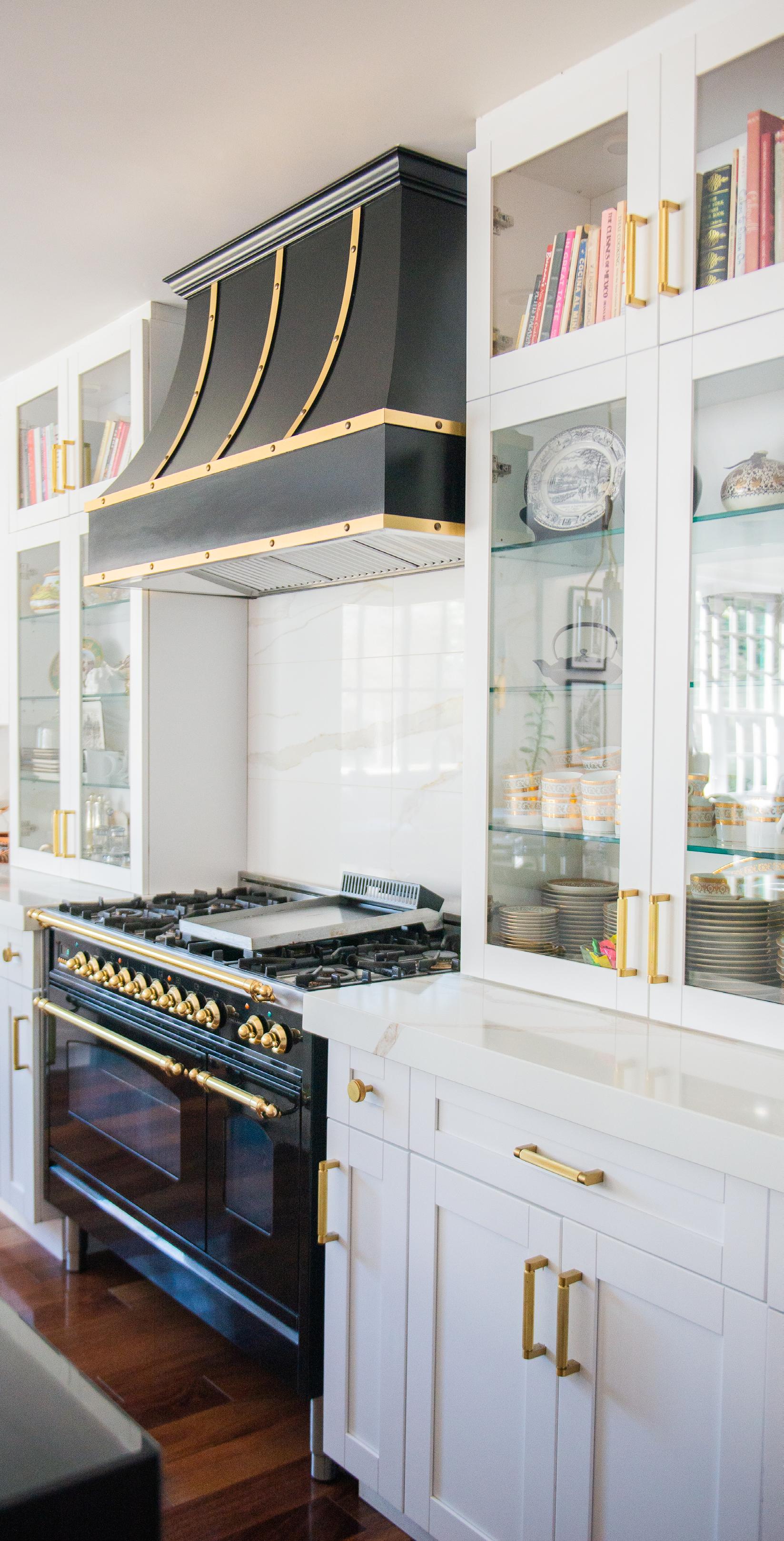 Spanish Porcelanosa tiles make up the backsplash and cultured countertops were custom-made to match. A black Forno Espresso oven with antique brass trim breaks up the modern white kitchen. Jammet Seignolles Exclusive Limoges china, purchased from Bergdorf Goodman, are featured in the glass cabinet.