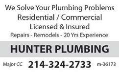 ARRIAGA PLUMBING: General Plumbing Since the 80’s. Insured. Lic# M- 20754 214-321-0589, 214-738-7116, CC’s accepted.