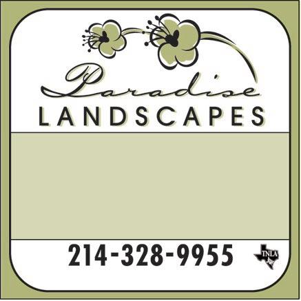 Your Trees Could Look Like a Work of Ar t, I Guarantee It. Free Estimates • Work Guaranteed Best Prices on Tree Removal Insured • Commercial & Residential • Tree & Landscape Lighting Call Mark Wittlich 214-332-3444 Colorful Impressions, Ltd. • Landscape Design • Installation • Maintenance 214-654-0202 http://colorfulimpressions.com Xeriscape Native Plants & Grasses Perennial & Annual Color Butterfly and Herb Gardens Dan Coletti 214-213-2147 www.JustNaturalDesign.com JUST NATURAL DESIGN Dan Coletti’s Azalea Beds Native Plants Custom Fences Custom Design Rock Walls Flagstone Patios low maintenance designs 214-228-8994 ”WE CARE ABOUT YOUR TREES” On Staff: • 4 - Cer tified Arborists • 1 - Tex- Tech Degreed Ag • 1 - Tex A&M Degreed Forester • 3 - Cer tified Applicators 214-327-9311 FULLY INSURED Commercial/Residential www.holcombtreeser vice.com Lawns, Gardens & Trees IRISH RAIN SPRINKLER SYSTEMS • Installation • Repair LANDSCAPE DESIGN CUSTOM STONE 22 Yrs. Exp. DRAIN PROBLEMS? We Can Help. Cer tified in Back Flow Prevention. Licensed by State of Texas #2738 214-827-7446 972-413-1800 www.salasservices.com Free Estimates Insured SerSalas vices Voted Best Budget Tree Service Aug ‘07 – D Magazine Over 20 years experience in Pruning Tree Removal Stump Grinding Pes T Con T ro L A BETTER EARTH PEST CONTROL Keeping the environment, kids, pets in mind. Organic products avail. 972-564-2495