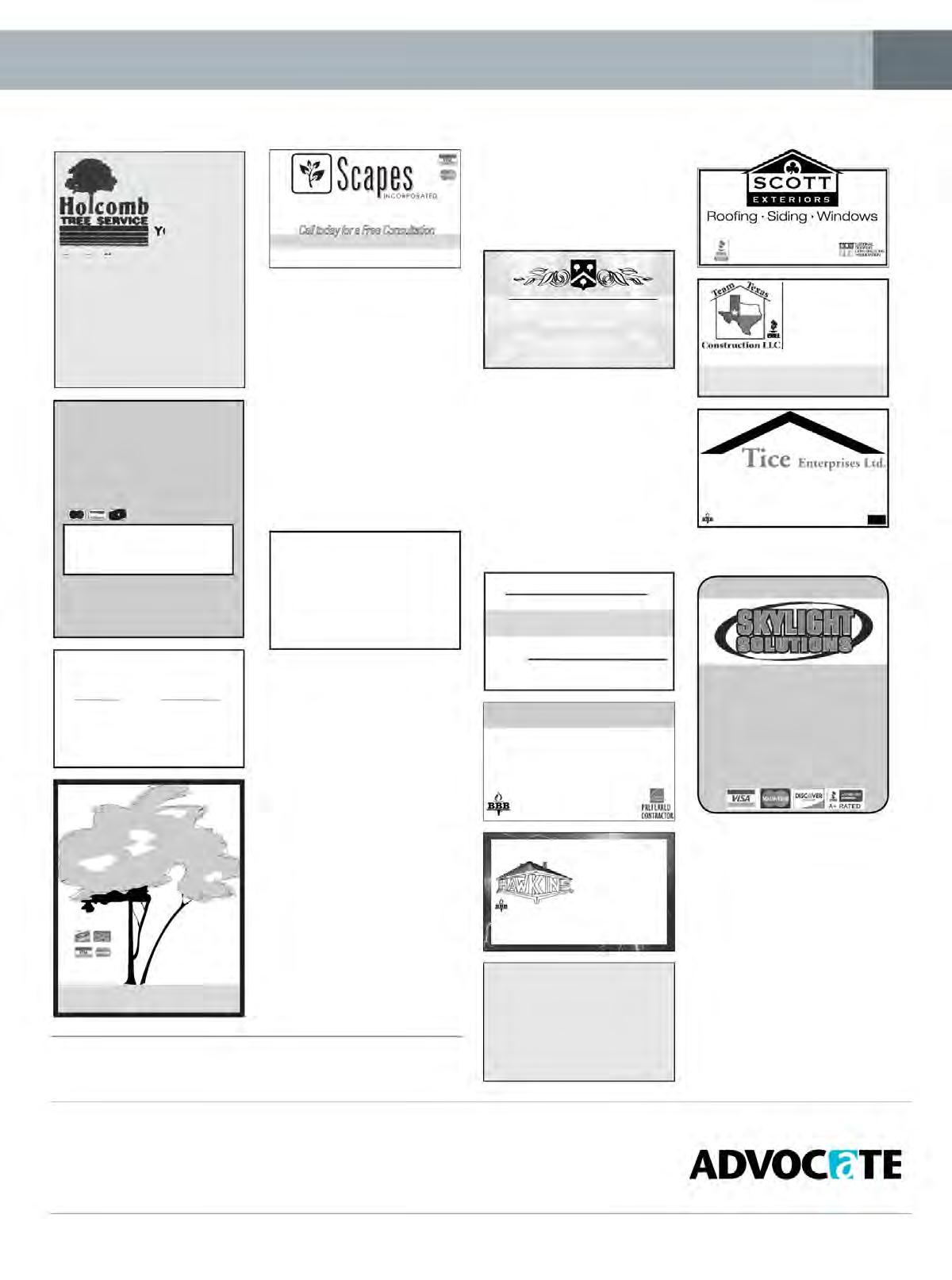 ADVOCATE PUBLISHING does not pre-screen, recommend or investigate the advertisements and/ or Advertisers published in our magazines. As a result, Advocate Publishing is not responsible for your dealings with any Advertiser. Please ask each Advertiser that you contact to show you the necessary licenses and/or permits required to perform the work you are requesting. Advocate Publishing takes comments and/or complaints about Advertisers seriously, and we do not publish advertisements that we know are inaccurate, misleading and/or do not live up to the standards set by our publications. If you have a legitimate complaint or positive comment about an Advertiser, please contact us at 214-5604203. Advocate Publishing recommends that you ask for and check references from each Advertiser that you contact, and we recommend that you obtain a written statement of work to be completed, and the price to be charged, prior to approving any work or providing an Advertiser with any deposit for work to be completed.