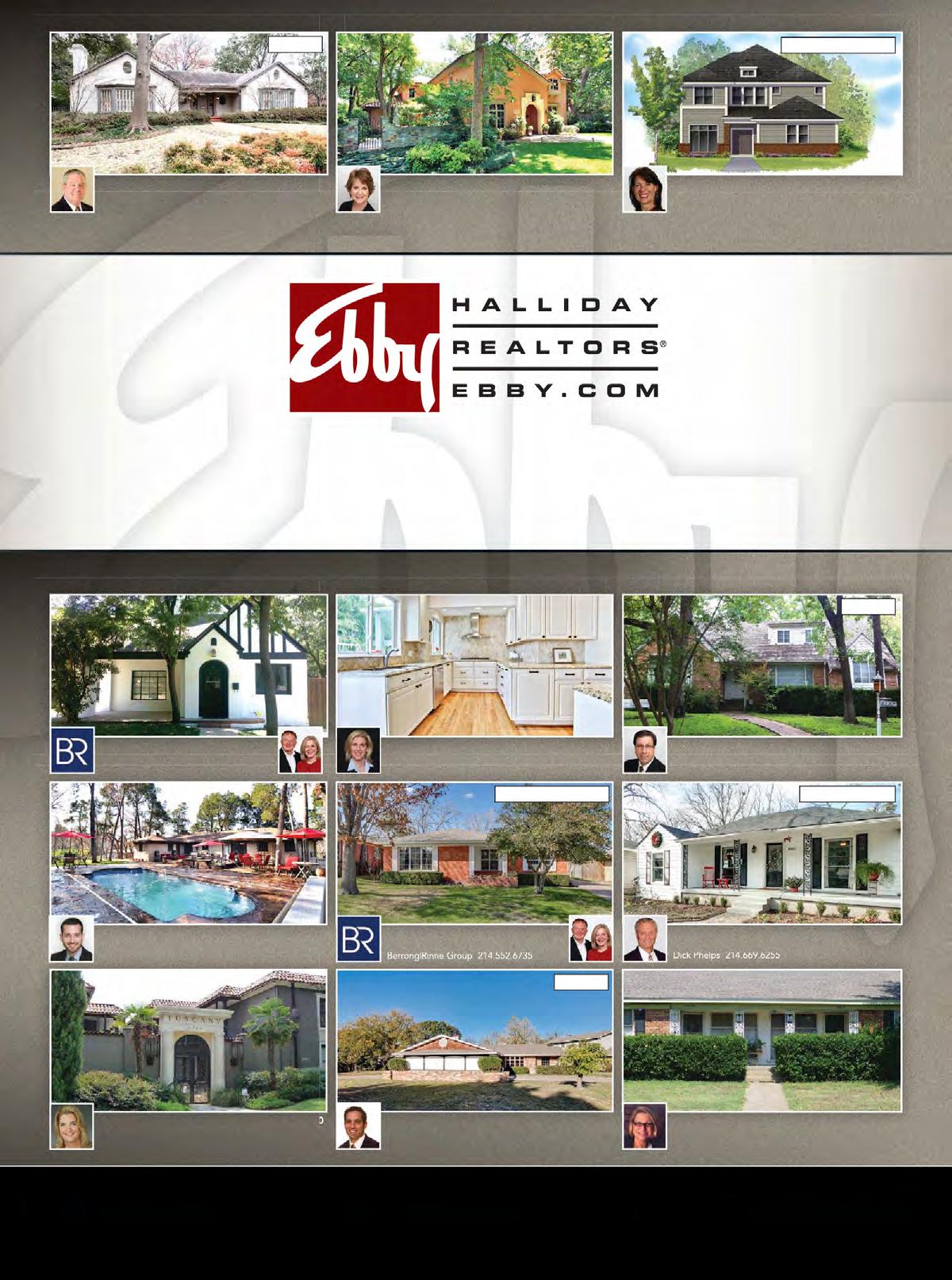 4255 WESTWAY 3/4.2/2 Highlaned Park Brick Ranch George Haynes 469.774.7405 8170 SAN BENITO $1,299,000 Tuscan inspired home just blocks from Dallas Arboretum CJ Prince 972.978.8986 6826 LA VISTA $987,000 Custom by DW-sleekly transitional inerpretation of Prairie styled home Victoria Barr 214.692.0000 731 N. GLASGOW $299,000 3/1/Updated Munger Place Tudor Berrong|Rinne Group 214.552.6735 6603 SANTA FE 4 bedrooms/3 baths/Lakewood Elementary Kim Sinnott 214.536.8786 8107 SAN CRIST0BAL 2 Story Home in Forest Hills Kim Nikolis 214.460.5456 3304 MCNEIL $235,000 3+ acrea estate in East Dallas. 3/3/4/pool Ryan Booth 214.692.0000 6955 ABBEY $229,900 3/2 Charming Vintage near WR Lake Berrong|Rinne Group 214.552.6735 8907 FOREST HILLS $224,950 Updated Little Forest Hills Dick Phelps 214.669.6255 5926 SANDHURST $155,000 Gated resort style community, updated 2/2 condo at Tuscany Julie Pillans 214.692.0000 EBBY PRESTON CENTER | 214.692.0000 EBBY WHITE ROCK/LAKE HIGHLANDS | 214.341.0330 EBBY LAKEWOOD | 214.826.0316 EBBY’S LITTLE WHITE HOUSE | 214.210.1500 THE FIRST NAME IN REAL ESTATE FOR LAKEWOOD AND EAST DALLAS TM SOLD 10015 OLMOSA $134,000 Full spacious duplex, 2/1/1 each side, tenant occupied Patti Flanders 214.692.0000 9555 VINEWOOD 3/2/2 in quiet neighborhood in White Rock Forest Jorge Goldsmit 214.245.5357 SOLD SOLD NEW LISTING NEW PRICE NEW LISTING