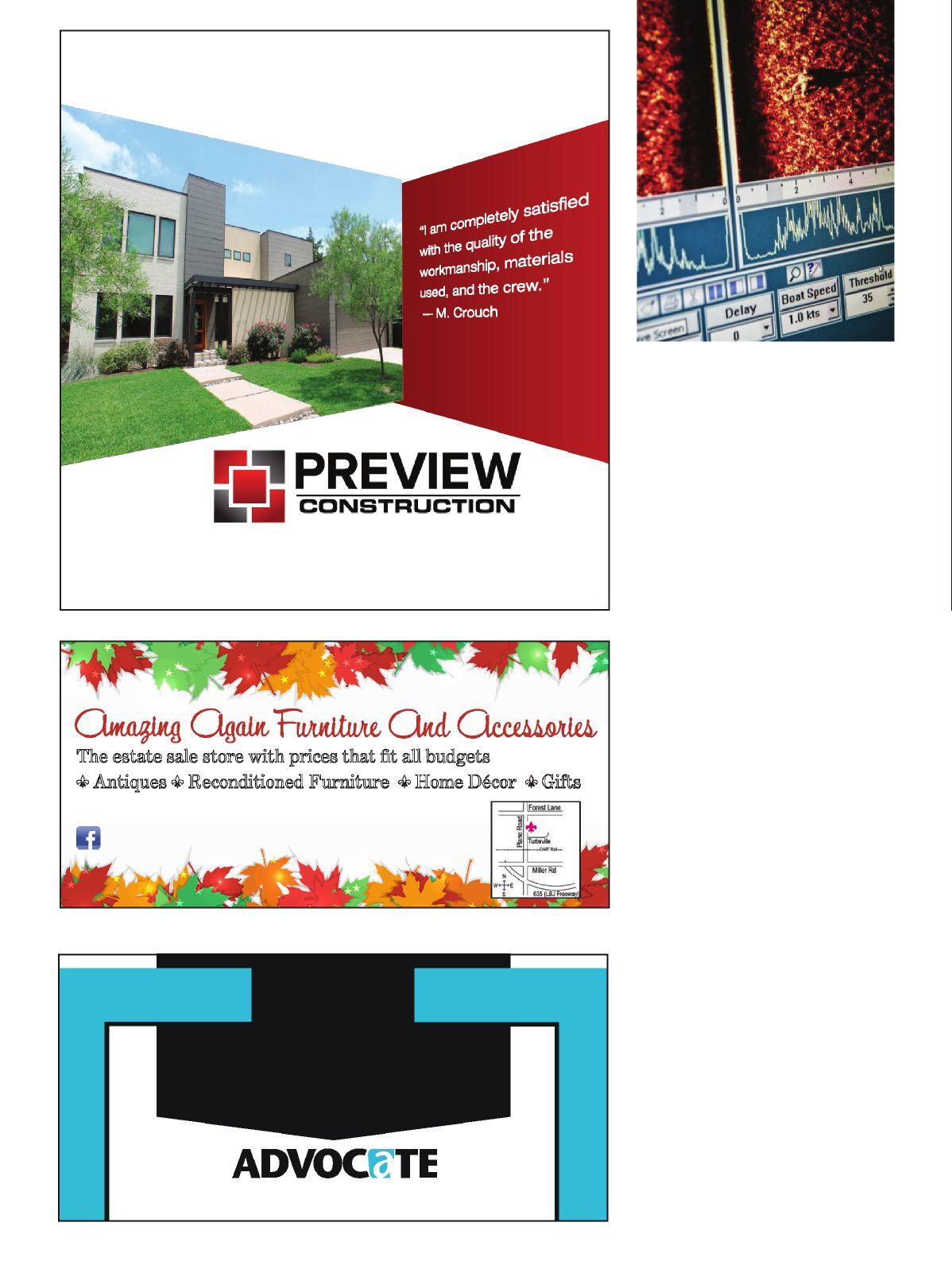 ADVOCATE PUBLISHING does not pre-screen, recommend or investigate the advertisements and/or Advertisers published in our magazines. As a result, Advocate Publishing is not responsible for your dealings with any Advertiser. Please ask each Advertiser that you contact to show you the necessary licenses and/or permits required to perform the work you are requesting. Advocate Publishing takes comments and/or complaints about Advertisers seriously, and we do not publish advertisements that we know are inaccurate, misleading and/or do not live up to the standards set by our publications. If you have a legitimate complaint or positive comment about an Advertiser, please contact us at 214560-4203. Advocate Publishing recommends that you ask for and check references from each Advertiser that you contact, and we recommend that you obtain a written statement of work to be completed, and the price to be charged, prior to approving any work or providing an Advertiser with any deposit for work to be completed.