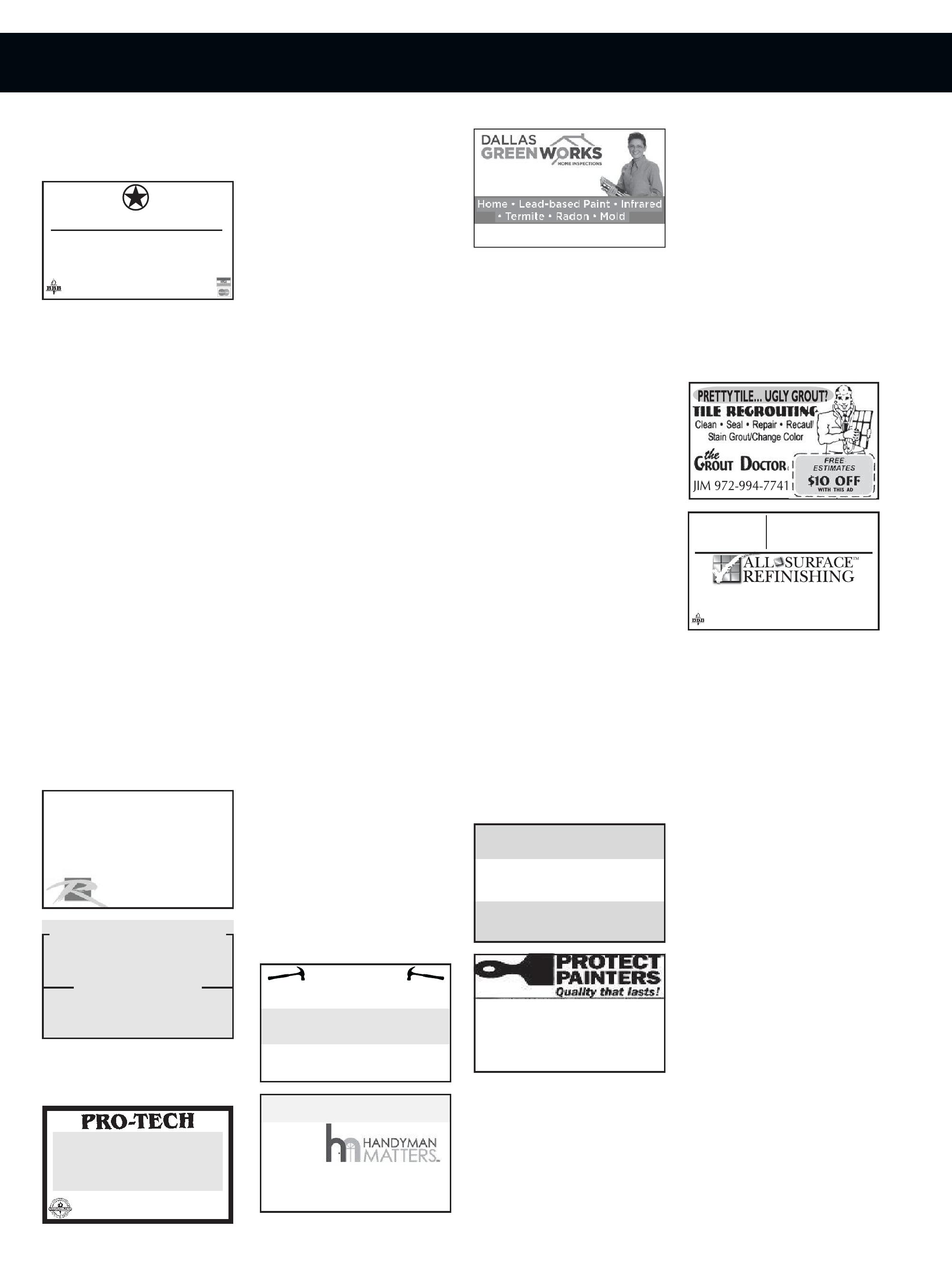 ADVOCATE PUBLISHING does not pre-screen, recommend or investigate the advertisements and/or Advertisers published in our magazines. As a result, Advocate Publishing is not responsible for your dealings with any Advertiser. Please ask each Advertiser that you contact to show you the necessary licenses and/or permits required to perform the work you are requesting. Advocate Publishing takes comments and/or complaints about Advertisers seriously, and we do not publish advertisements that we know are inaccurate, misleading and/or do not live up to the standards set by our publications. If you have a legitimate complaint or positive comment about an Advertiser, please contact us at 214-5604203. Advocate Publishing recommends that you ask for and check references from each Advertiser that you contact, and we recommend that you obtain a written statement of work to be completed, and the price to be charged, prior to approving any work or providing an Advertiser with any deposit for work to be completed.