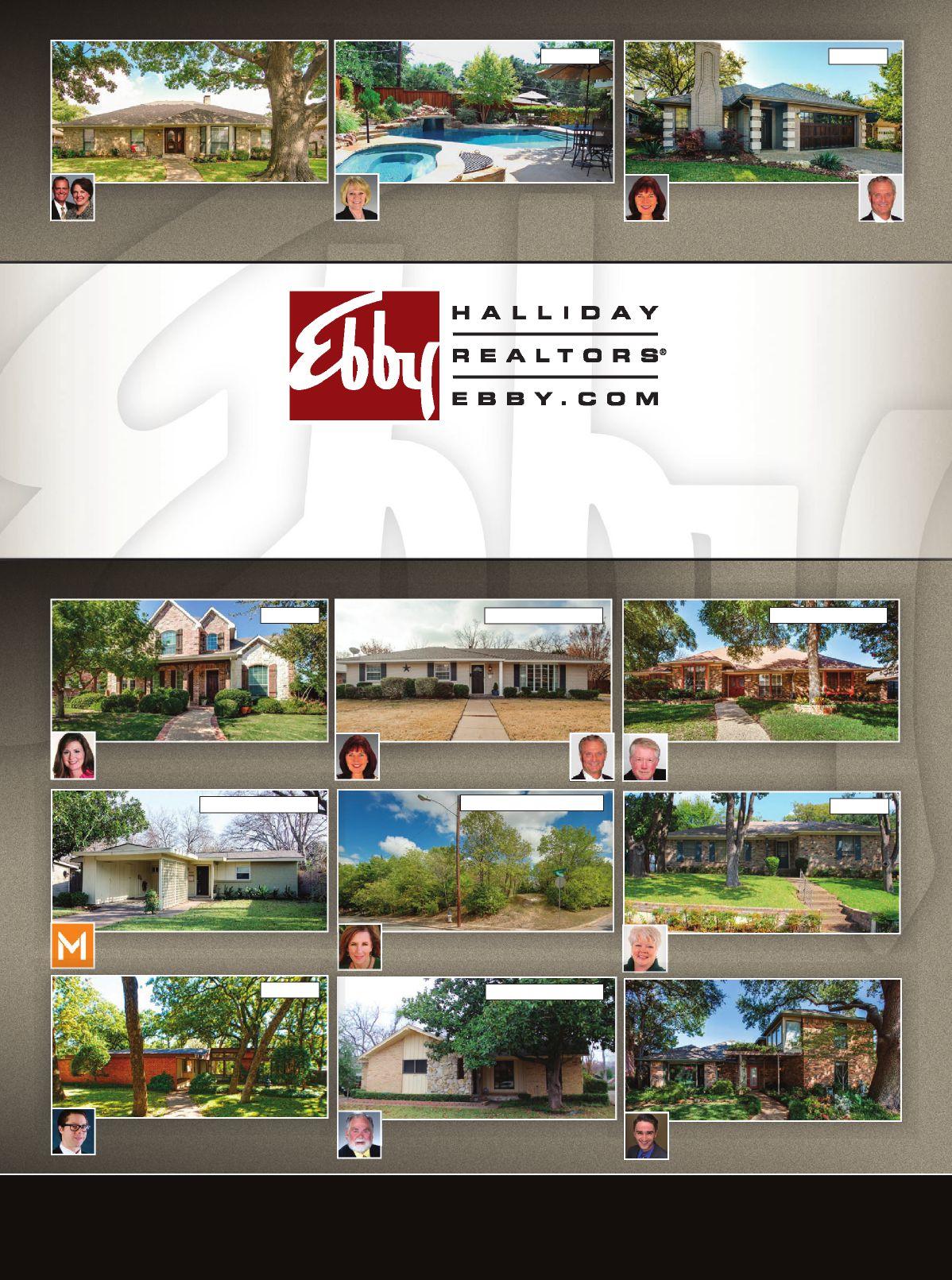 THE FIRST NAME IN REAL ESTATE FOR LAKE HIGHLANDS AND EAST DALLAS TM LAKEWOOD | 214-826-0316 PRESTON CENTER | 214-692-0000 WHITE ROCK/LAKE HIGHLANDS | 214-341-0330 EBBY’S LITTLE WHITE HOUSE | 214-210-1500 9115 WEBB KAY DR. $480,000 4/3/3 Car Garage/4 LA/Cul-de-sac Lot/RISD- Moss Haven Elem. The Selzer Group - theselzergroup.com 214.797.0868 SALE PENDING 10908 CREEKMERE DR. $187,000 71’ x 100’ Res. Corner Lot in Lochwood- Build your Dream Home! Konnie Clayton - konnieclayton.ebby.com 214.708.5233 RESIDENTIAL LOT 6732 SANTA ANITA DR. $199,900 3/2/Hdwds/Period Tile Baths/Charming Mid-Century Modern Amy Malooley - amymalooley.ebby.com 214.773.5570 10101 CHERRY TREE DR. $290,000 4/3/2/Updated/Open Floor Plan/Granite Kitchen/Richardson ISD Bobby Stephens - bobbystephens.ebby.com 214.395.4579 SALE PENDING 10607 MAPLEGROVE LN. 3/2/2/2 LA/FP/Nice Lochwood Home Denise Lowry - deniselowry.ebby.com 214.228.1622 SOLD 214 TULANE ST. (GARLAND) $134,500 3/2/2/FP/Nice Kitchen/Den With Vaulted Ceiling/On Treed Creek Lot Charles Hollingsworth - charleshollingsworth.ebby.com 214.808.6086 NEW LISTING NEW LISTING 5832 YOLANDA DR. 3/2/2 LA/Spacious Renovated Mid-Century Modern Mike Bryant - mikebryant.ebby.com 214.686.5611 SOLD 1703 SPLINTER DR. 4/3/2/2 LA/Hdwds/Large Island Kitchen/Spacious 2-Story April Deats - aprildeats.ebby.com 214.601.8757 SOLD 9734 WINDLEDGE DR. 4/3.1/2/2 LA/Stunning Home, Every Update Imaginable/Pool, Spa Jan Stell - janstell.com 214.355.3118 SOLD 7920 NIMROD TRAIL 3/2/2/White Rock Elementary/Wood Floors/Built 1986 The Dybvad and Phelps Group 214.354.2823 SOLD 3218 JUBILEE TRAIL $299,000 3/2.1/2/3 LA’s/Updated Charmer/Granite/Fireplace/Sunroom The Dybvad and Phelps Group 214.354.2823 NEW LISTING 11108 VALLEYDALE DR., UNIT A $102,500 2/2/Updates/First Floor Condo/Fresh Paint/Near Pool Evan Stewart - evanstewart.ebby.com 214.692.0000