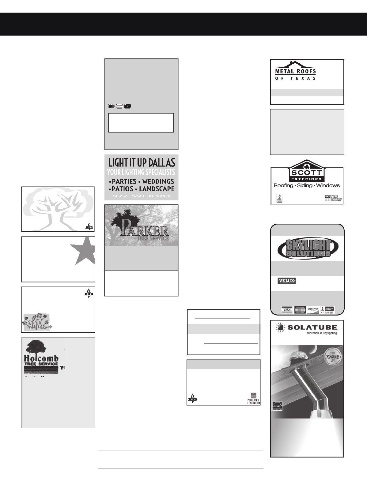–• Free Estimates 214-824-0767 allstatehomecraft.com BERT ROOFING INC. Family owned and operated for over 40 years • Residential/Commercial • Over 30,000 roofs completed • Seven NTRCA “Golden Hammer” Awards • Free Estimates www.bertroofing.com 214.321.9341 ROOFING & GUTTERS 972-746-2197 • MetalRoofsofTexas.com Never re-roof again. Free 10-Point Inspection & Estimate Shake, Slate, Shingle, Tile, Standing Seam Roof Repair Specialist •Exterior Repair & Re-Roofing •Insurance Claims • Custom Chimney Caps • Licensed & Fully Insured Jeff Godsey 214-502-7287 Residential • Commercial (214) 503-7663 www.scottexteriors.com FREE ESTIMATES LICENSED and INSURED SKYLIGHTS Installing Since 1995 972-263-6033 www.skylightsolutions.com Glass •Acrylic Solatubes & Sun Tunnels Replacement, Repair & New Installation by Daylight Rangers SHOWCASE YOUR SPACE 972-985-1700 2830 W 15th St. Plano, TX 75075 www.DaylightRangers.com