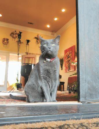 RIGHT Halle the housecat sits in the doorframe.