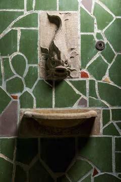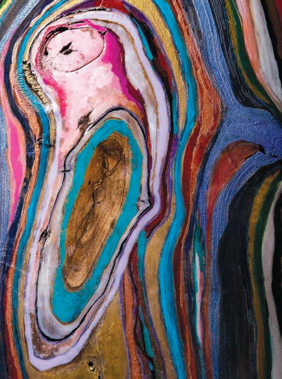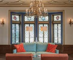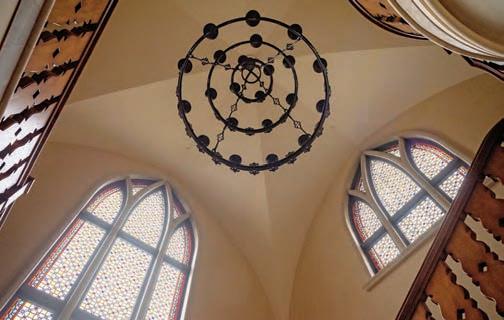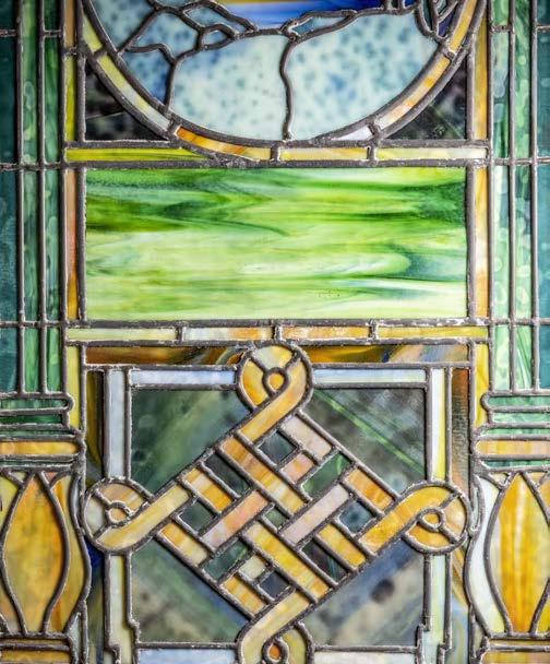 Photography by Danny Fulgencio. A pane of stained glass embedded with broken glass and pottery from the old McCommas and Abrams Estate hangs in the remodeled home. Read more on page 86.