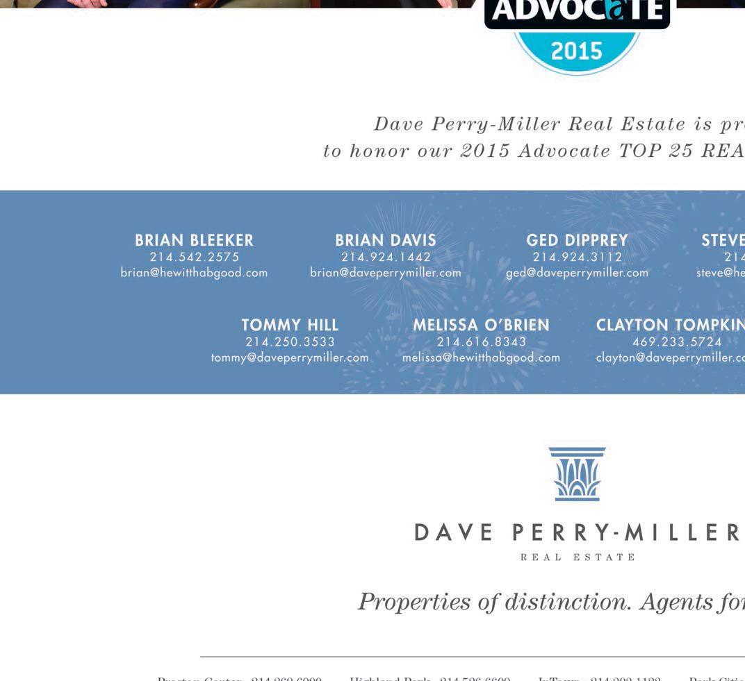 be local be local most used logo black and white used for small horizontal used for small vertical and social media Advocate Media 6301 Gaston Avenue, Suite 820, Dallas, TX 75214 Advocate, © 2016, is published monthly by East Dallas – Lakewood People Inc. Contents of this magazine may not be reproduced. Advertisers and advertising agencies assume liability for the content of all advertisements printed, and therefore assume responsibility for any and all claims against the Advocate. The publisher reserves the right to accept or reject any editorial or advertising material. Opinions set forth in the Advocate are those of the writers and do not necessarily reflect the publisher’s