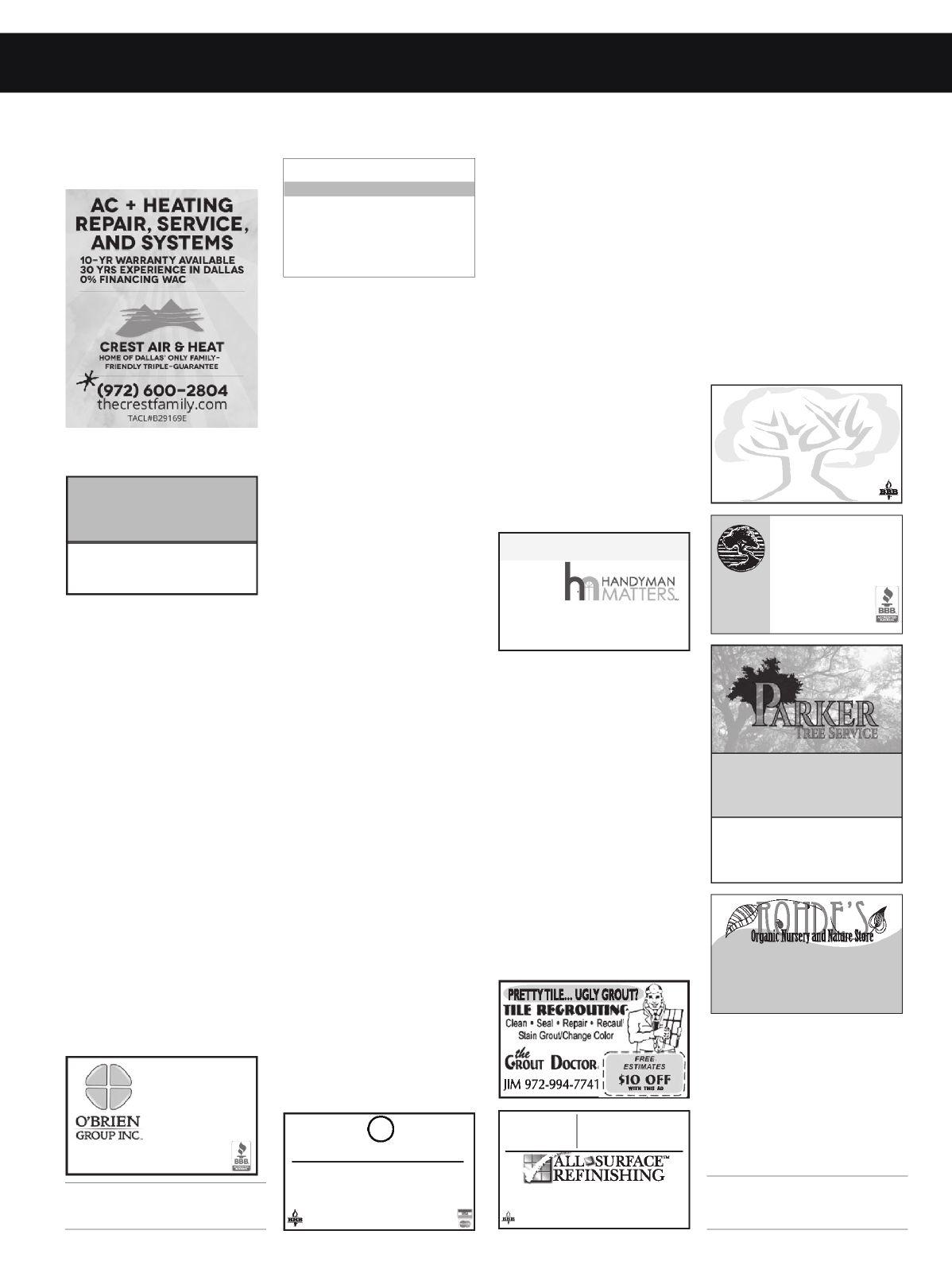 ADVOCATE PUBLISHING does not pre-screen, recommend or investigate the advertisements and/ or Advertisers published in our magazines. As a result, Advocate Publishing is not responsible for your dealings with any Advertiser. Please ask each Advertiser that you contact to show you the necessary licenses and/or permits required to perform the work you are requesting. Advocate Publishing takes comments and/or complaints about Advertisers seriously, and we do not publish advertisements that we know are inaccurate, misleading and/or do not live up to the standards set by our publications. If you have a legitimate complaint or positive comment about an Advertiser, please contact us at 214-5604203. Advocate Publishing recommends that you ask for and check references from each Advertiser that you contact, and we recommend that you obtain a written statement of work to be completed, and the price to be charged, prior to approving any work or providing an Advertiser with any deposit for work to be completed.
