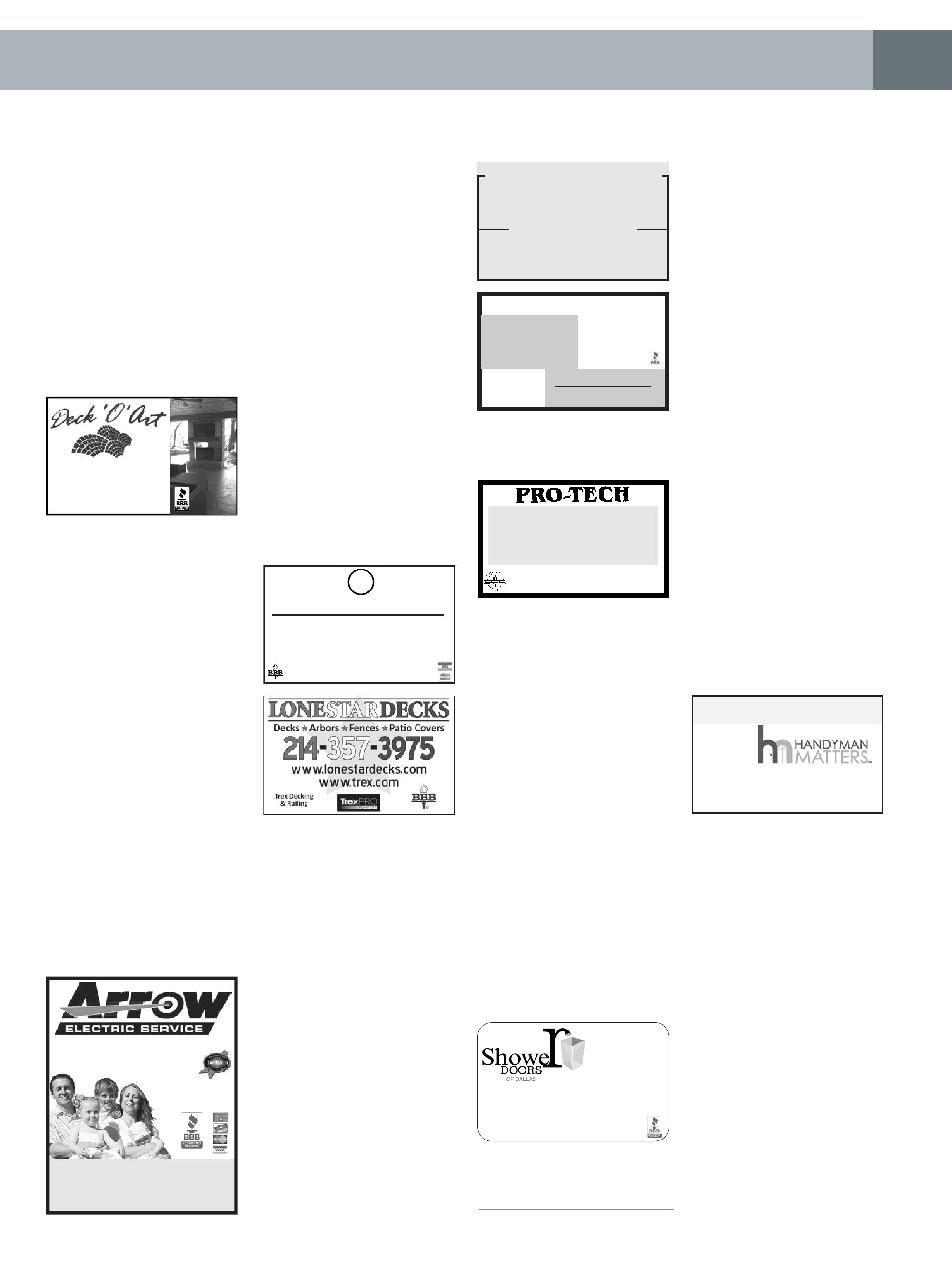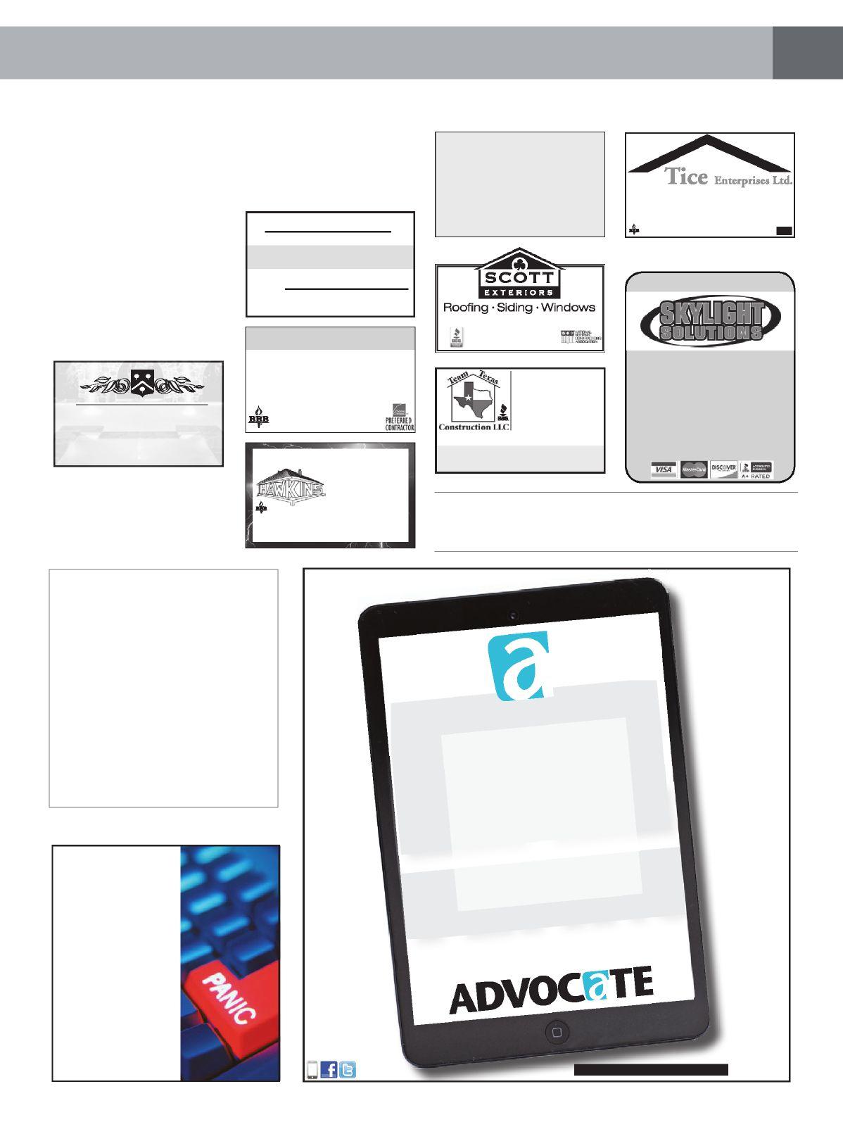 ADVOCATE PUBLISHING does not pre-screen, recommend or investigate the advertisements and/or Advertisers published in our magazines. As a result, Advocate Publishing is not responsible for your dealings with any Advertiser. Please ask each Advertiser that you contact to show you the necessary licenses and/or permits required to perform the work you are requesting. Advocate Publishing takes comments and/or complaints about Advertisers seriously, and we do not publish advertisements that we know are inaccurate, misleading and/ or do not live up to the standards set by our publications. If you have a legitimate complaint or positive comment about an Advertiser, please contact us at 214-560-4203. Advocate Publishing recommends that you ask for and check references from each Advertiser that you contact, and we recommend that you obtain a written statement of work to be completed, and the price to be charged, prior to approving any work or providing an Advertiser with any deposit for work to be completed.