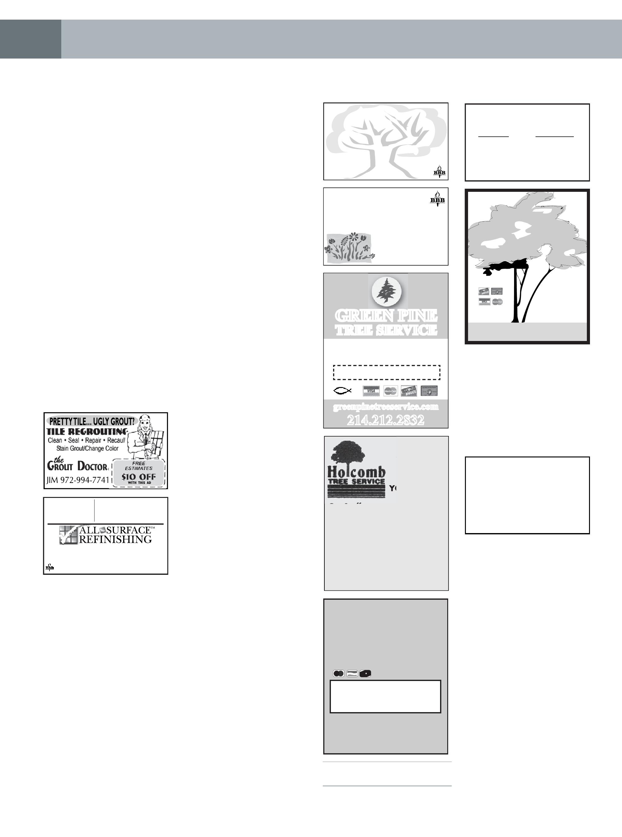 lawns, garDens & trees JUST TREES A Better Tree Company Your Trees Could Look Like a Work of Art, I Guarantee It. Free Estimates • Work Guaranteed Best Prices on Tree Removal Insured • Commercial & Residential Tree & Landscape Lighting • Fence & Deck Call Mark Wittlich 214-332-3444 Xeriscape Native Plants & Grasses Perennial & Annual Color Butterfly and Herb Gardens Dan Coletti 214-213-2147 www.JustNaturalDesign.com JUST NATURAL DESIGN Dan Coletti’s GREEN PINE TREE SERVICE greenpinetreeservice.com 214.212.2832 Exceptional Quality at Affordable Prices Insured • Senior Discounts • Free Estimates Spring Special: 10% OFF ”WE CARE ABOUT YOUR TREES” On Staff: • 4 - Certified Arborists • 1 - Tex- Tech Degreed Ag • 1 - Tex A&M Degreed Forester • 3 - Certified Applicators 214-327-9311 FULLY INSURED Commercial/Residential www.holcombtreeservice.com IRISH RAIN SPRINKLER SYSTEMS • Installation • Repair LANDSCAPE DESIGN CUSTOM STONE 25 Yrs. Exp. Certified in Back Flow Prevention. Licensed by State of Texas #2738 214-827-7446 Mastercard Discover SPRING SPECIAL 10% Off Installation MAXIMUM DISCOUNT $200 lawns, garDens & trees MTY LAWN CARE & TREE SERVICE COMPLETE LAWN CARE · Most yards $20-$30 · Hedge Trimming PROFESSIONAL TREE SERVICE · Tree Removal · Stump Grinding 25 yrs experience insured Juan Pacheco 972.310.9477 Residential/Commercial 972-413-1800 www.salasservices.com Free Estimates Insured Salas Services Over 20 years experience in Pruning Tree Removal Stump Grinding MovIng ALL-TEX MOVERS Free Estimates. 11Yr. BBB Member. www.all-texmovers.com 214-869-6566