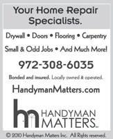M ETAL S PECIALIST –• Free Estimates 214-824-0767 allstatehomecraft.com Building a better roof for you. Residential & Commercial Roofing 214·698·8443 arringtonroofing.com Roofing & gutteRs BERT ROOFING INC. Family owned and operated for over 40 years • Residential/Commercial • Over 29,000 roofs completed • Six NTRCA “Golden Hammer” Awards • Free Estimates www.bertroofing.com 214.321.9341 PPG ROOFING 214-642-4704 • Residential • Commercial • Roof Repair • Free Estimates • Licensed Roof Repair Specialist •Exterior Repair & Re-Roofing •Gutter Cleaning • Custom Chimney Caps • Licensed & Fully Insured Jeff Godsey 214-502-7287 Roofing & gutteRs Residential • Commercial (214) 503-7663 www.scottroofing.com FREE ESTIMATES LICENSED INSURED Scott Roofing • Siding • Windows Licensed Insured PROFESSIONAL ROOFING CONTRACTOR (214) 319-0040 FREE INSPECTION Commercial • Residential info@ticeenterprises.net NTRCA WoodWoRking SHUTTERS We install beautiful plantation shutters. Also wood blinds. Free paint match · Free Estimates James Wilcox 214.532.7708 Call 214-560-4203 to advertise september deadliNe august 11
