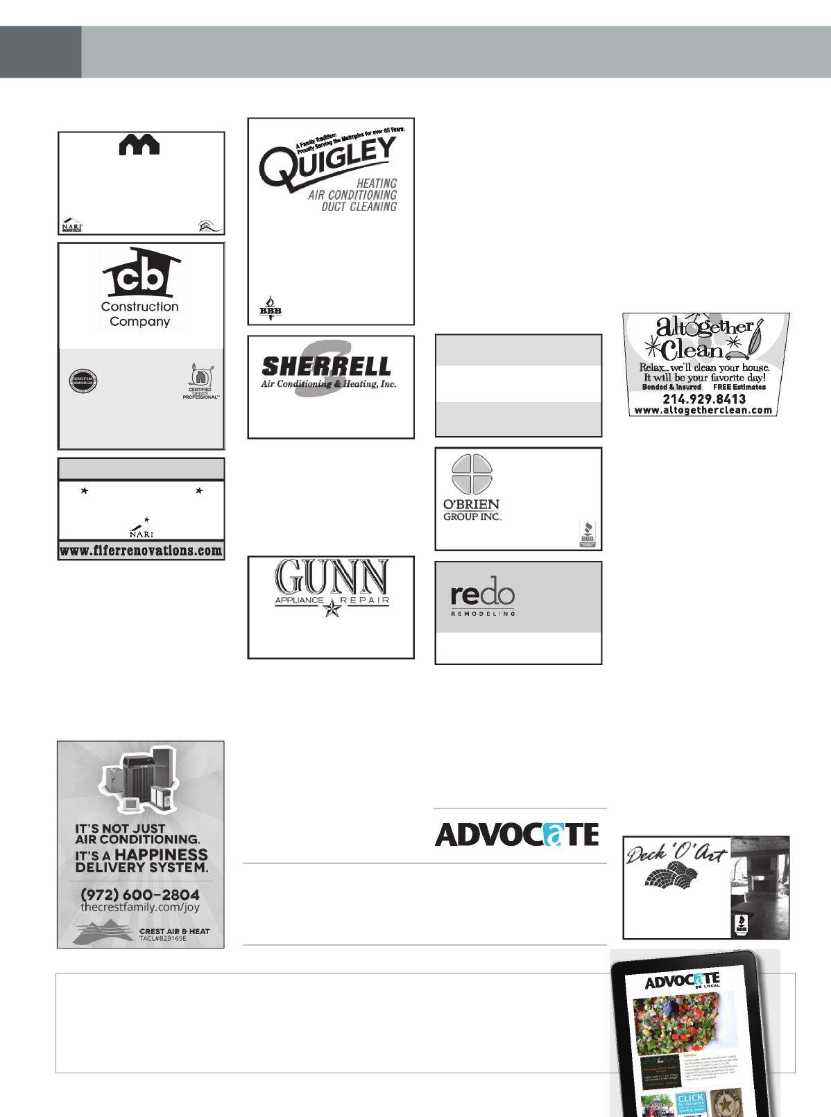 ADVOCATE PUBLISHING does not pre-screen, recommend or investigate the advertisements and/ or Advertisers published in our magazines. As a result, Advocate Publishing is not responsible for your dealings with any Advertiser. Please ask each Advertiser that you contact to show you the necessary licenses and/or permits required to perform the work you are requesting. Advocate Publishing takes comments and/or complaints about Advertisers seriously, and we do not publish advertisements that we know are inaccurate, misleading and/or do not live up to the standards set by our publications. If you have a legitimate complaint or positive comment about an Advertiser, please contact us at 214-560-4203. Advocate Publishing recommends that you ask for and check references from each Advertiser that you contact, and we recommend that you obtain a written statement of work to be completed, and the price to be charged, prior to approving any work or providing an Advertiser with any deposit for work to be completed.
