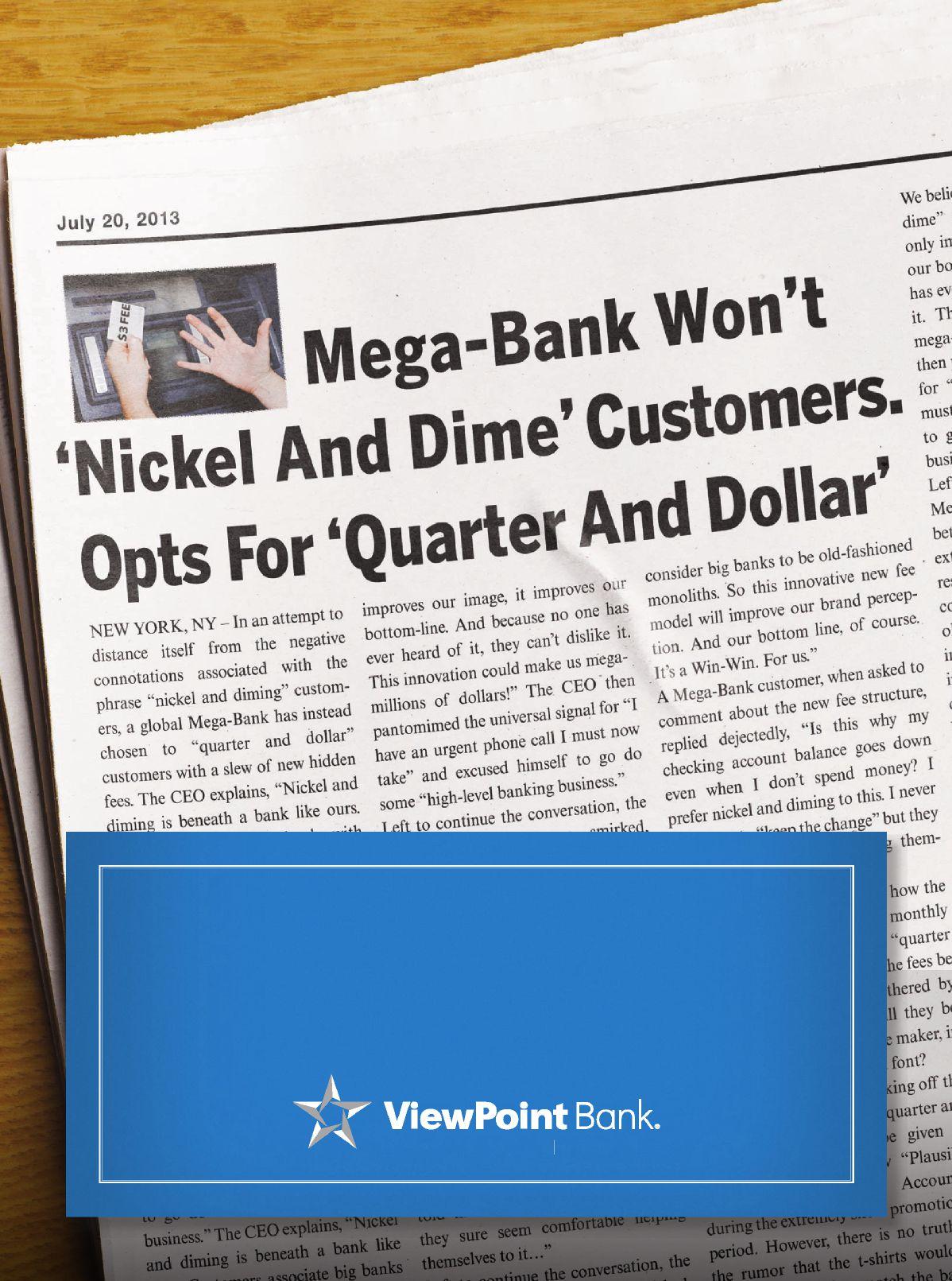 viewpointbank.com 972-578-5000 Change is good, when it’s to 100% free checking and ATMs. ViewPoint Bank Absolute Checking is 100% free checking, free online banking and free ATMs anywhere in the world. So you are free to keep more of your hard-earned money working for you. Ready for a change for the better, and to get what you pay for in a bank? We’re ready when you are. MEMBER FDIC. Account requirements must be met.