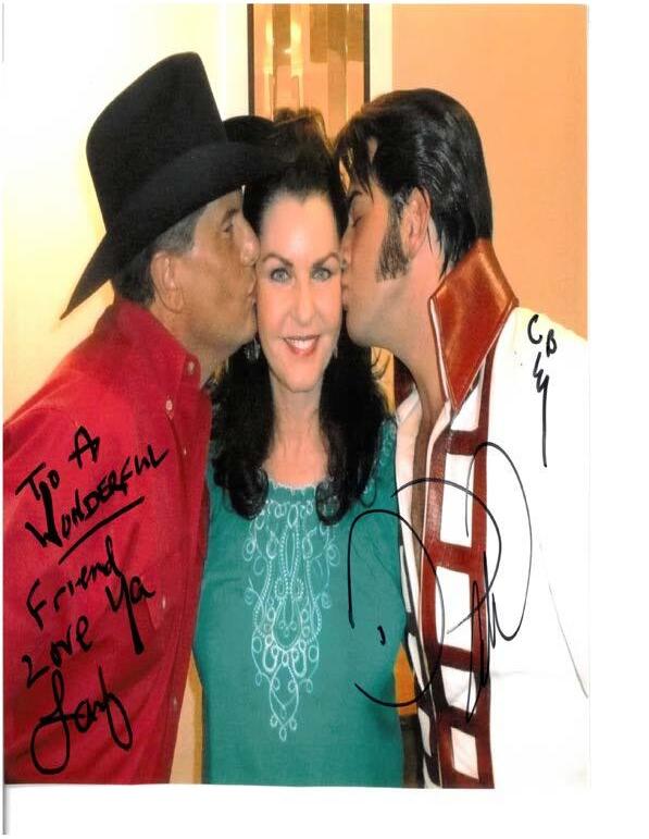 Kay Shannon in between George Strait impersonator Larry Turner and Elvis Presley impersonator David Allen. Photography courtesy of Kay Shannon.