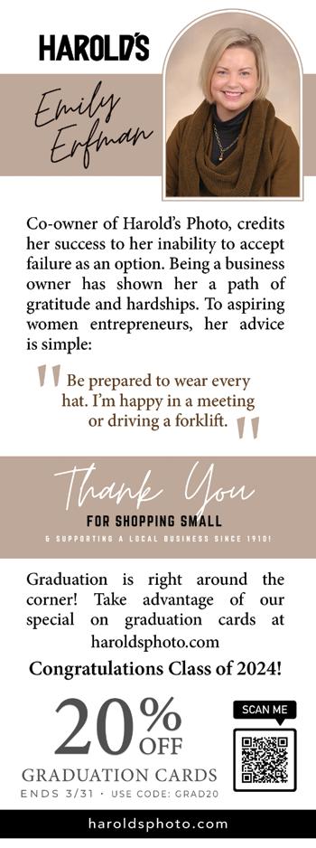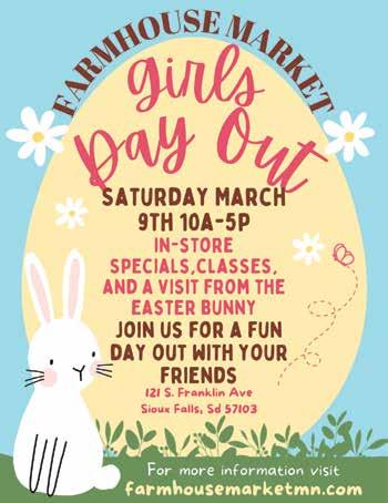 Publisher Angela Efting Ellerbroek (605) 351-5515 email: etc.mag@sio.midco.net www.etcsiouxfalls.com www.facebook.com/etcforher etc. for her is published monthly and distributed free in Sioux Falls. The content used in this magazine is copyright 2024 etc. for her and may not be reprinted in part or in whole without written consent by the publisher. All articles and editorial material represent the opinions of the respective authors. Sioux Falls’ Favorite Women’s Magazine nest RECIPES Cinnamon Breakfast Cake 23 THE A LIST 24 AT HOME Office Redesign Pairs Love of Cars, Love of History 26 MAN IN THE KITCHEN Irish for Just One Day 30 THRIFTING HOME Thrifting Flora and Fauna 34 VINO And the Oscar Goes to… Wine! 36 BEST FRIENDS Submit Your Pet’s Photo 38 FOR KIDS Fun Fitness Games at Home 40 iStockphoto® used on pages: 8,22 Graphic Design Jen (Sandvig) Pfeiffer Design Loft, LLC out & about CONCIERGE Looking for a New Lunch Spot? Try the WP. 10 CALENDAR March 2024 12 HISTORY Charles K. Howard: “If it were not for him—” 18 26 17 24 MARCH 2024 2024 42