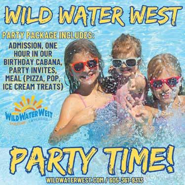 Make a splash and celebrate your birthday at Wild Water West! Party Package includes admission, one hour in birthday cabana, party invites, meal (pizza and pop) and ice cream treats! Visit wildwaterwest.com or call (605) 361-9313 for more information.